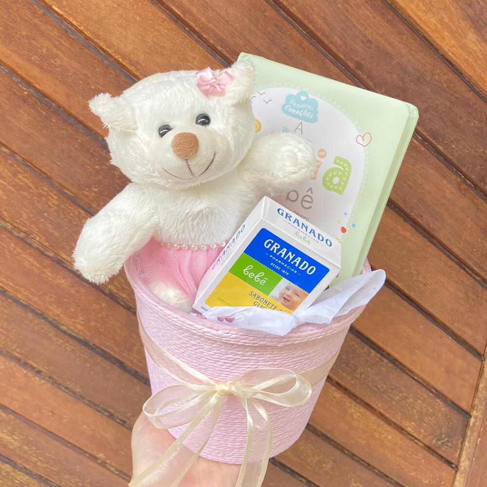 laço - 1 un. saco celofane transparente para embalar - 1 un. ursinho de pelúcia bailarina 28cm - 1 un. bíblia do bebê - 1 un. sabonete de glicerina granado 90g - 1 un. cesta rosa bebê redonda - 1 un.