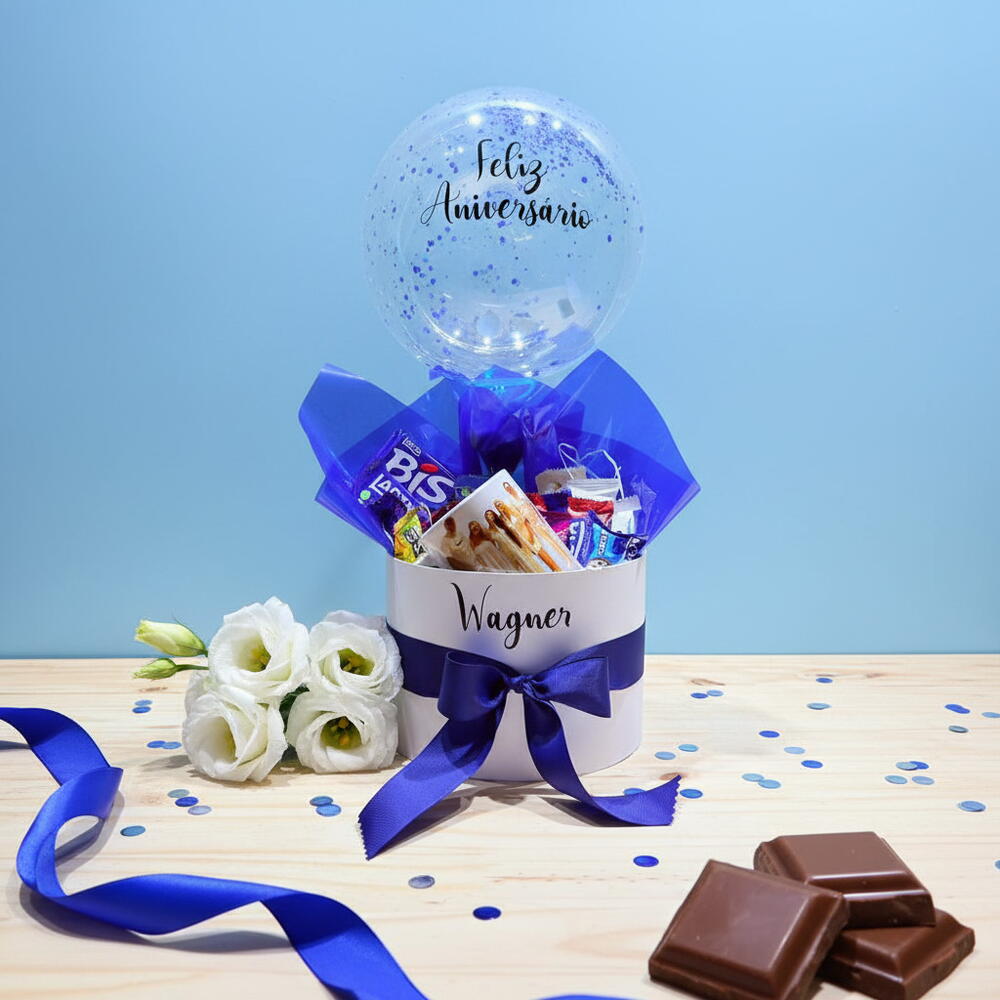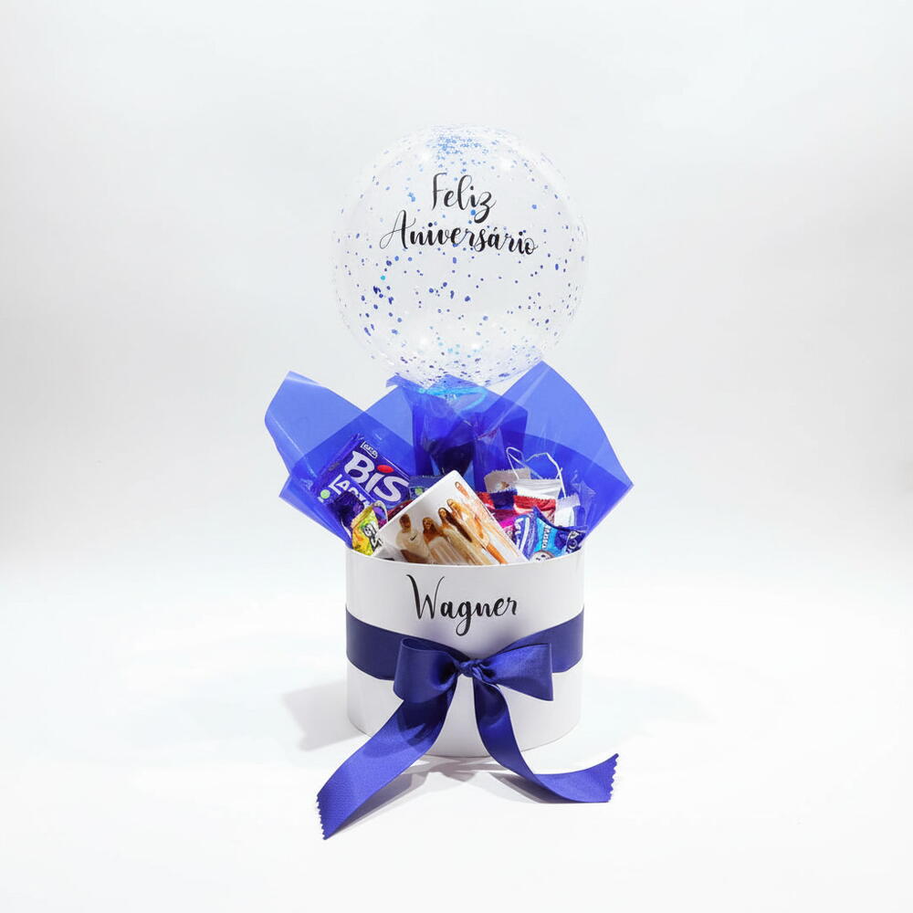 urso de pelúcia - 1 un. balão personalizado - 1 un. chocolate kitkat - 2 un. chocolate kinder bueno - 1 un. box cartonada personalizada - 1 un.