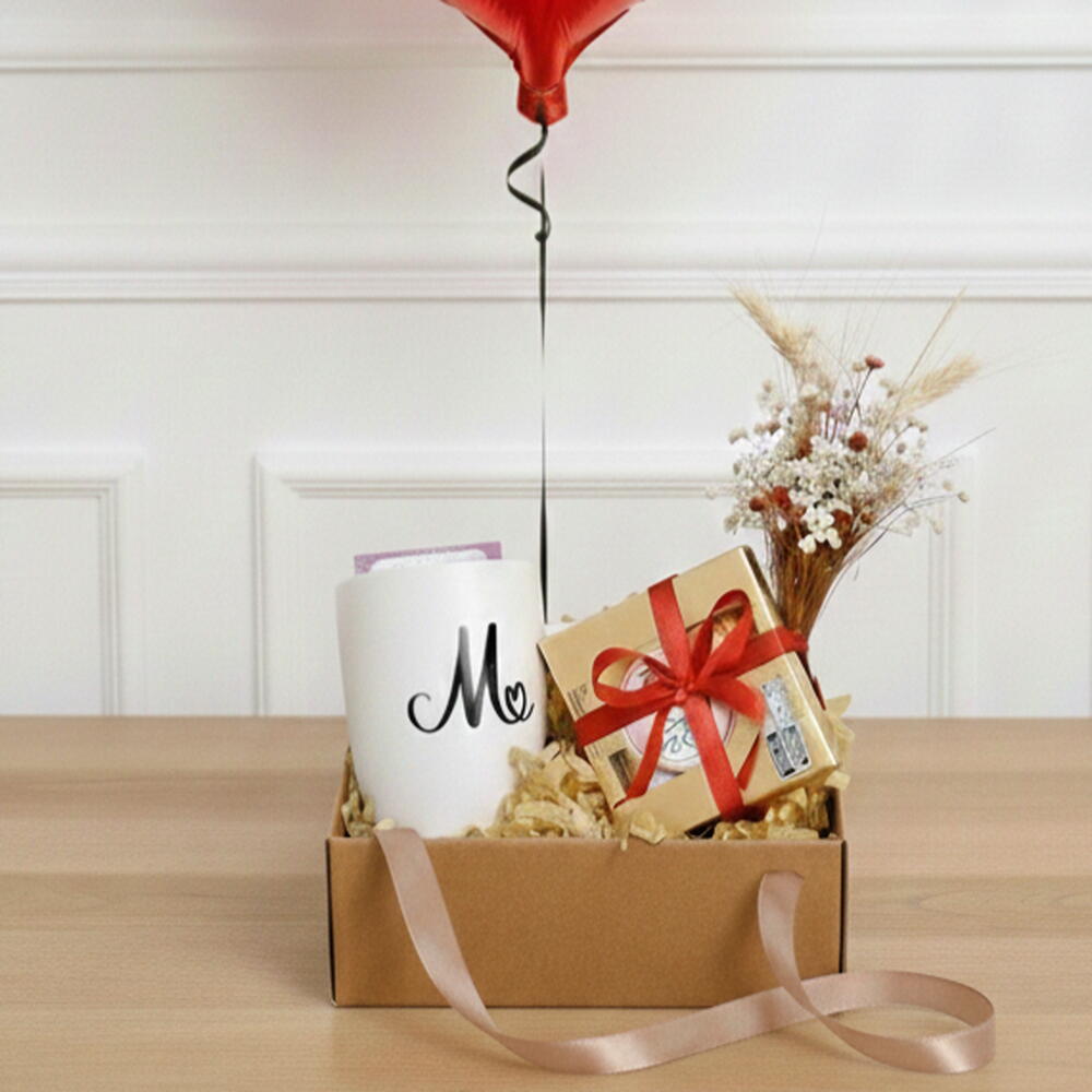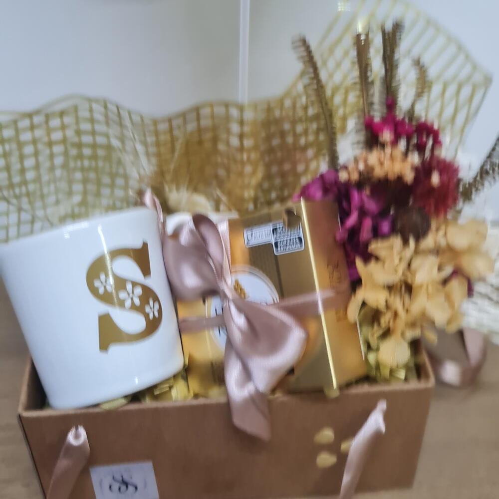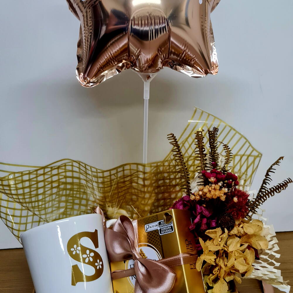 mini buque de flores secas - 1 un. sache de chá - 2 un. caixa elegante - 1 un. ferrero roche com 4 - 1 un. caneca personalizada com inicial do nome do presenteado - 1 un. balão coração metalizado 22 cm personalizado - 1 un.