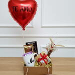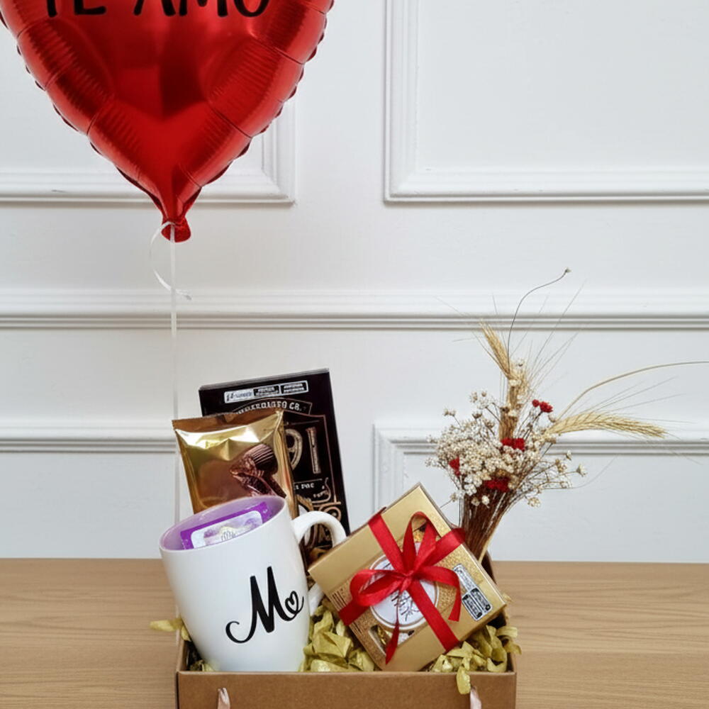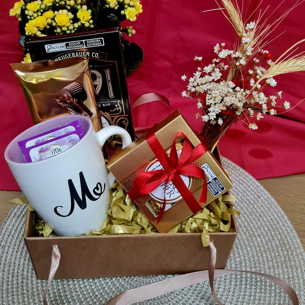 mini buque de flores secas - 1 un. saches de chá - 2 un. ferrero roche com 4 - 1 un. caneca personalizada com inicial do nome do presenteado - 1 un. barras de chocolate premium - 2 un. balão coração metalizado 22 cm personalizado - 1 un.