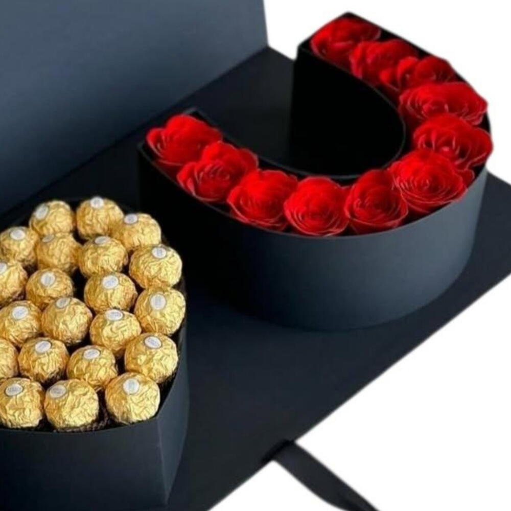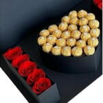 Deleite-se com a elegância deste box luxuoso, repleto de 18 deslumbrantes rosas vermelhas, uma verdadeira declaração de amor e paixão. Acompanhado de 26 luxuosos bombons Ferrero Rocher, este presente é uma celebração de indulgência irresistível. Apresentado em uma bela caixa preta cartonada com a inscrição I Love You, e finalizado com um laço especial, este presente vai surpreender a pessoa amada com um gesto de amor puro e sofisticação.