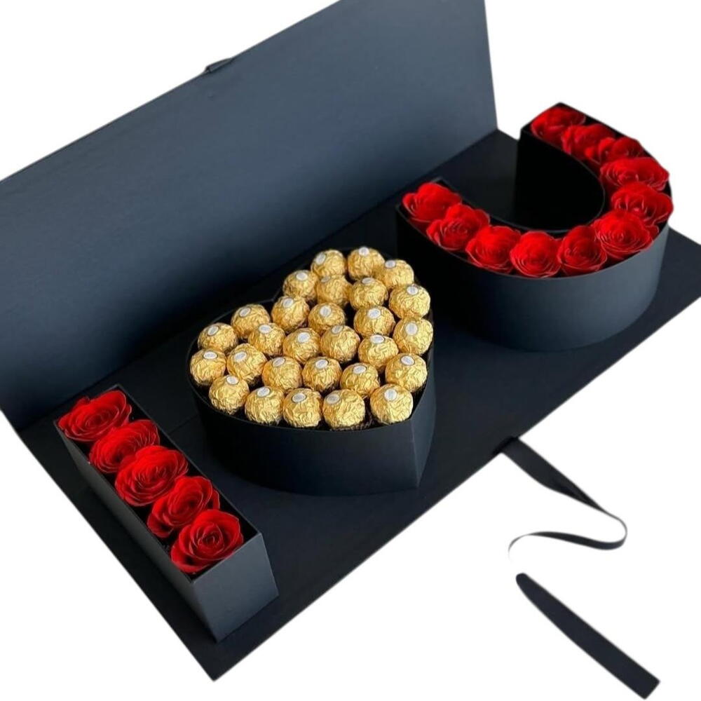 rosa vermelha - 18 un. bombom ferrero rocher - 26 un. laço especial - 1 un. box cartonado preto i love you - 1 un.