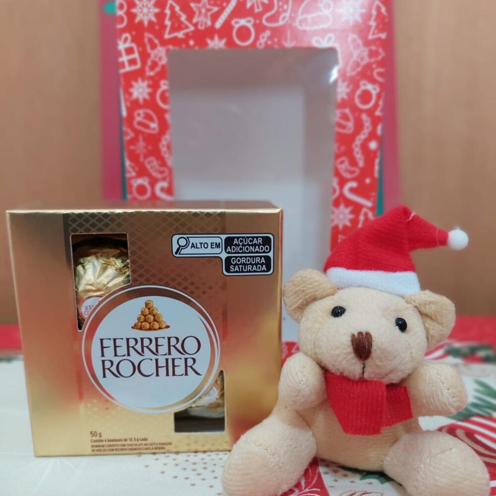 laço decoração - 1 un. caixa de natal decorada - 1 un. pelucia natalino chaveiro - 1 un. ferrero de 4un - 1 un.