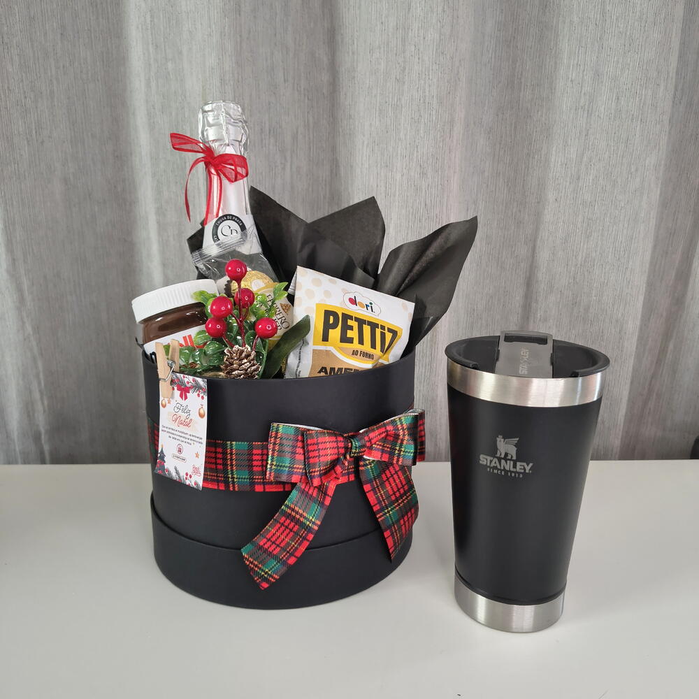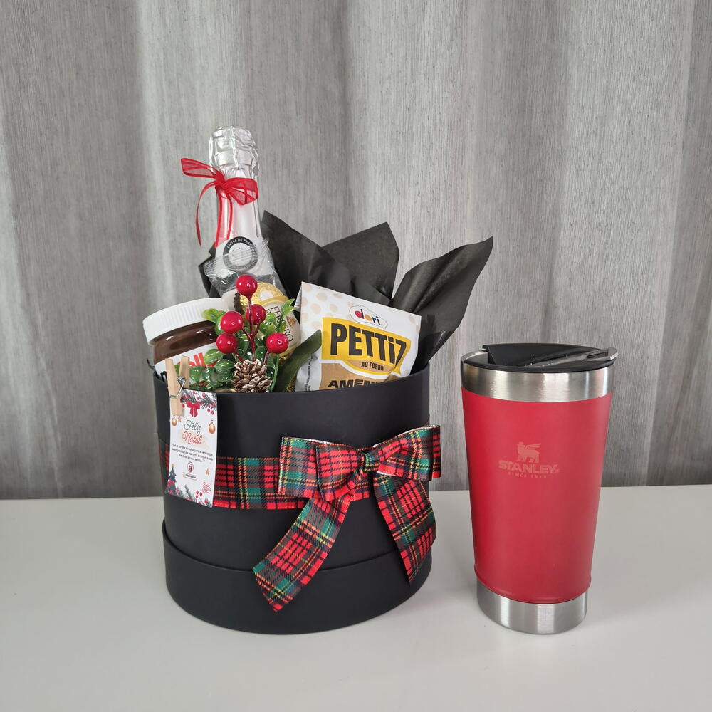 amendoim crocante pettiz 50g - 1 un. trio ferrero rocher - 1 un. nutella 140 g - 1 un. copo térmico stanley 473 ml - 1 un. champanhe chuva de prata 660 ml - 1 un. enfeite de decoração natalina - 1 un.