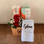 arranjo com 3 rosa vermelhas - 1 un. cartão dedicatória - 1 un. caixa com 5 sabonetes natura todo dia - 1 un. creme de hidratação para o corpo natura todo dia - 200 ml toalha de lavabo com nome gravado - 1 un. box em mdf (15 cm x 15 cm x 10 cm) personalizado com nome - 1 un.