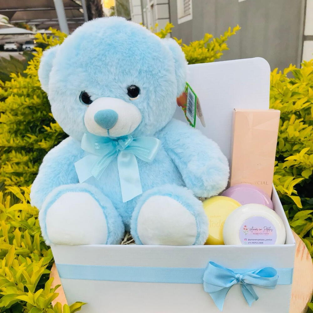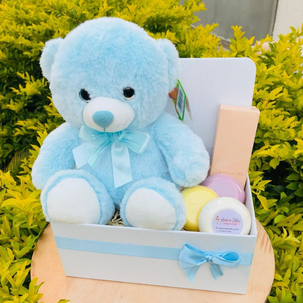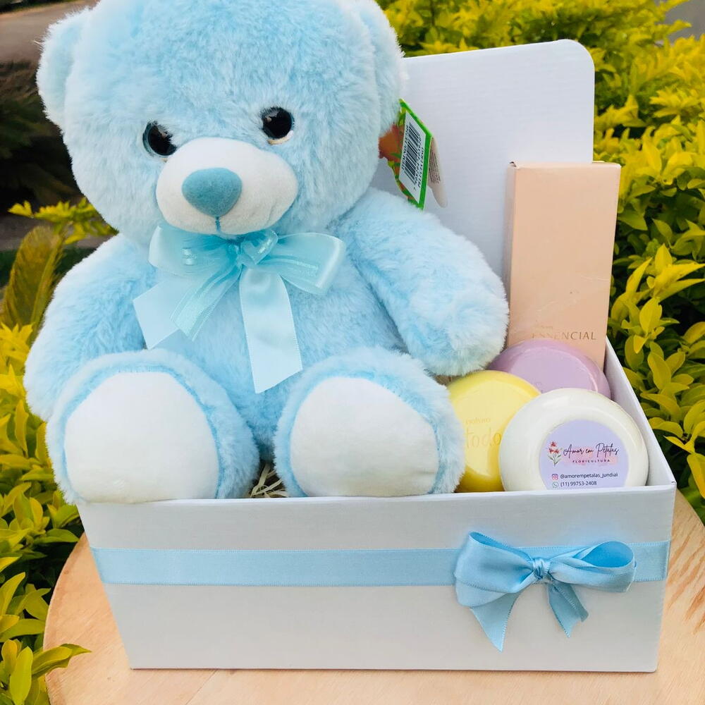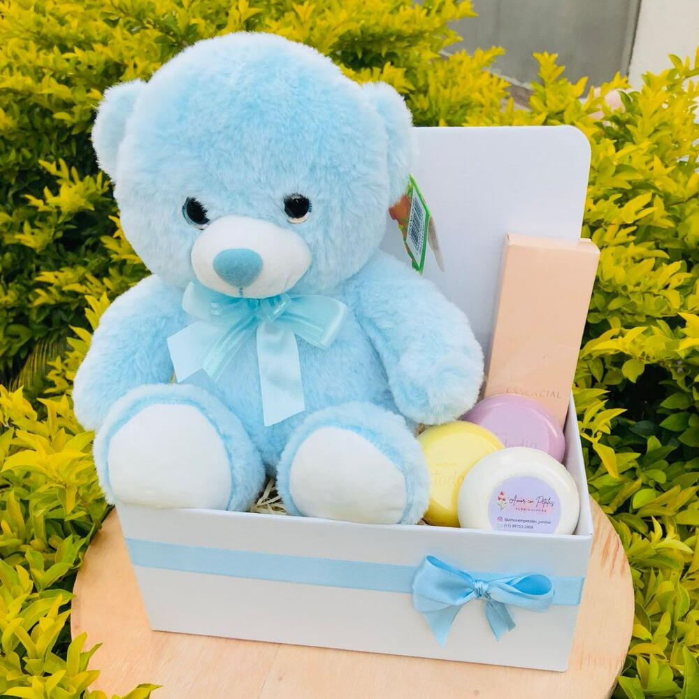 urso de pelúcia - 1 un. caixa (box) - 1 un. sabonete corporal natura essencial (80ml) - 1 un. sabonetes natura todo dia - 3 un.