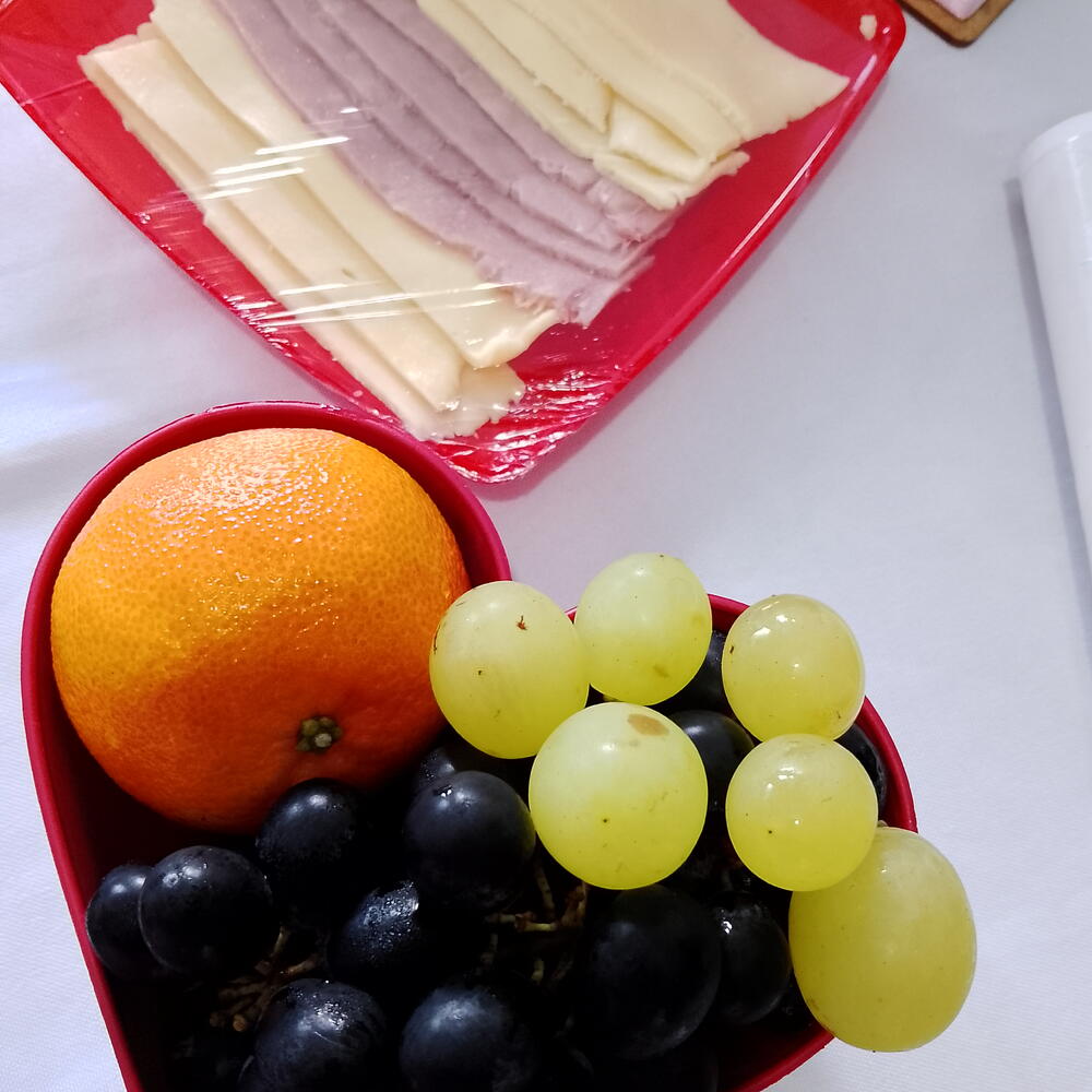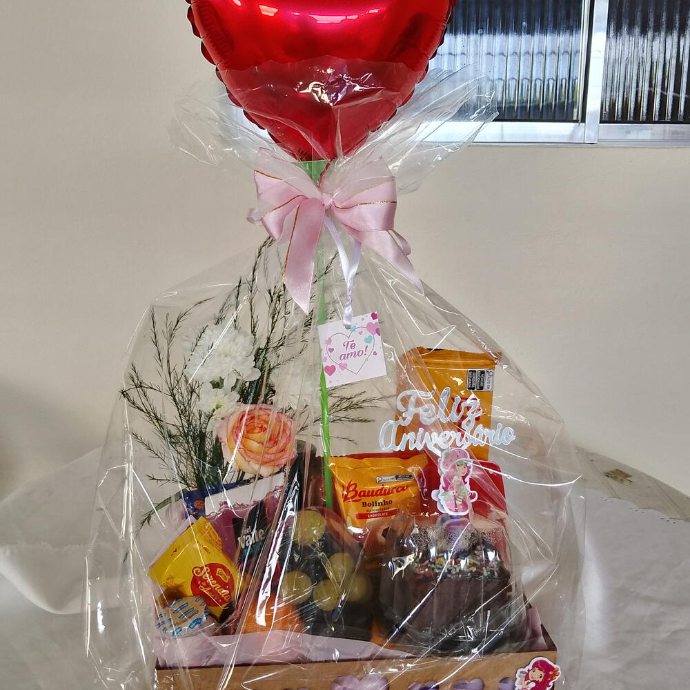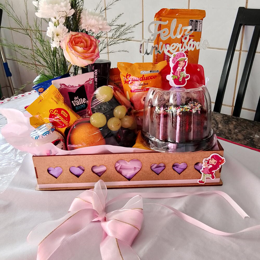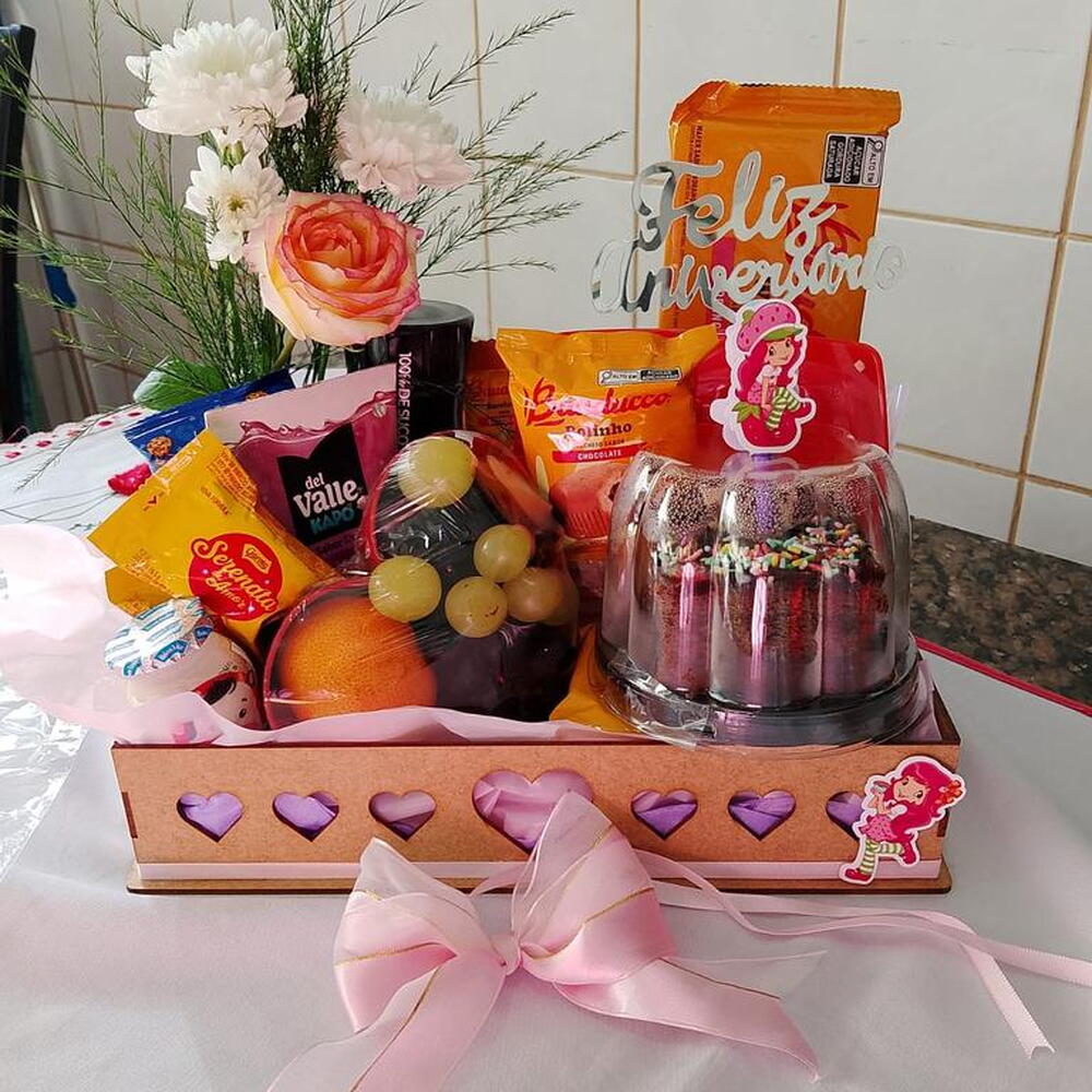 torradas - 2 un. suco de uva - 1 un. bolinho bauducco - 1 un. balão - 1 un. capuccino - 1 un. bombons - 3 un. frutas da estação - 3 un. poleguinhos - 2 un. barra de chocolate lacta ou nestlé - 1 un. iogurte nestlé - 1 un. choco biscoito bauducco - 1 un. flores do campo ou rosa em vasinho - 1 un. bolinho caseiro com topo - 1 un. geleia (sachê) - 2 un.