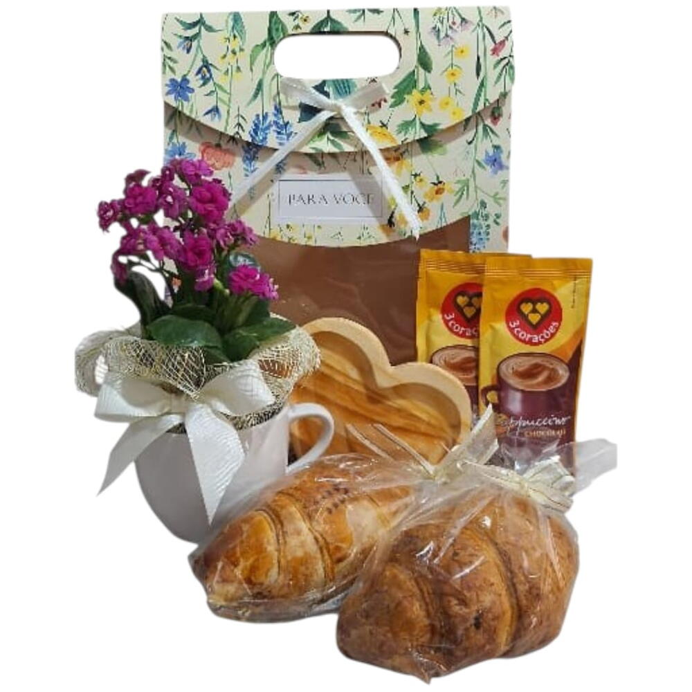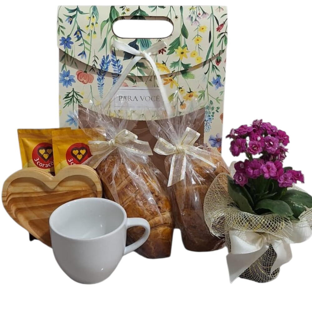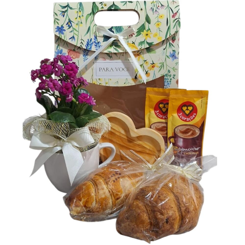 caixa decorada - 1 un. sache de capuccino - 2 un. croassant recheado presunto e queijo - 1 un. croassant de chocolate - 1 un. 1 xicará de porcelana branca com pires em madeira em forma de coração - 1 un. mini vasinho de flor kalanchoe decorado - 1 un.