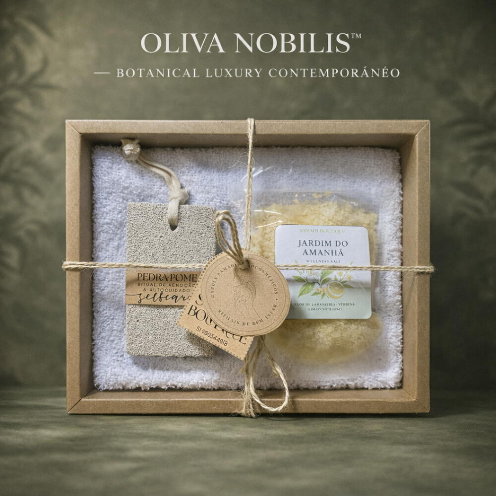 Box Presente Jardim do Amanhã — Ritual de Escalda-Pés ou Banho | Premium Um convite delicado ao descanso consciente. Este box sensorial reúne elementos naturais que transformam o cotidiano em ritual, e o toque em memória. Contém: • Pedra-pomes natural com cordão cru — esculpida pela natureza, remove suavemente as marcas do dia e prepara os pés para novos caminhos. • Toalha 100% algodão — toque macio, que envolve o corpo com calor e cuidado. • Wellness Salt “Jardim do Amanhã” (120g) — um blend botânico exclusivo com sal de Epsom, sal do Himalaia, sal de Mossoró, aveia, argila branca e óleos essenciais de flor de laranjeira, verbena e limão siciliano. Indicação de uso: Para banhos de imersão ou escalda-pés. Ao se dissolver na água, o sal libera notas cítricas e florais que acalmam a mente, despertam os sentidos e renovam a energia. Diferenciais: • Produto artesanal, vegano e sustentável • Aroma leve e vibrante, com toque botânico refinado • Embalagem kraft com tag exclusiva — ideal para presentes conscientes Para quem cultiva pausas com alma, e transforma o cuidado em poesia.