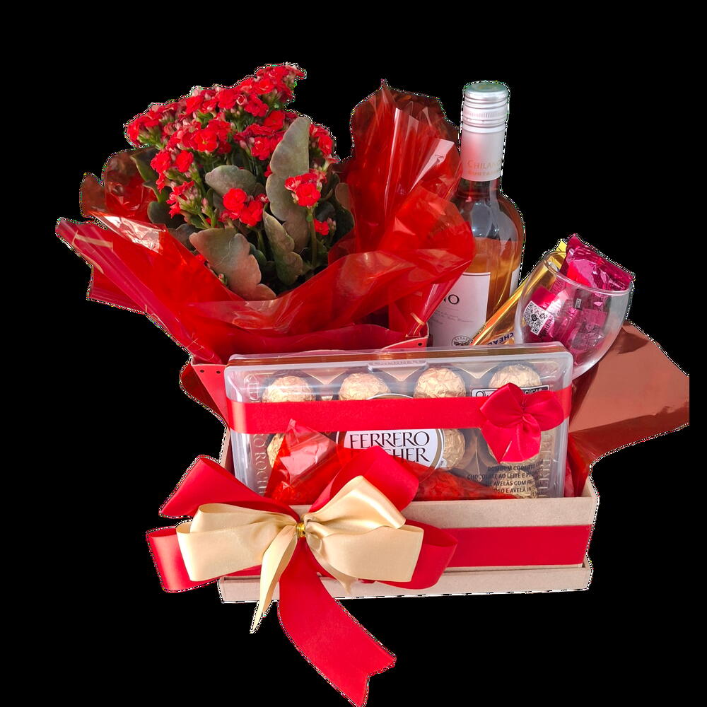 Este conjunto luxuoso de presente combina elementos românticos e deliciosos para criar a surpresa perfeita. Inclui uma caixa elegante com 5 Kalanchoes para adicionar um toque de cor viva, adicionando a isso uma taça clássica e um vinho requintado para desfrutar de momentos calmos. A cereja no topo deste maravilhoso presente são os 3 bombons irresistíveis e 12 Ferrero Rocher, embrulhados magistralmente com um laço para dar o toque final. Tudo apresentado em uma caixa glamourosa pronta para fazer sorrisos brilharem. Este é sem dúvida o presente perfeito para ser lembrado!