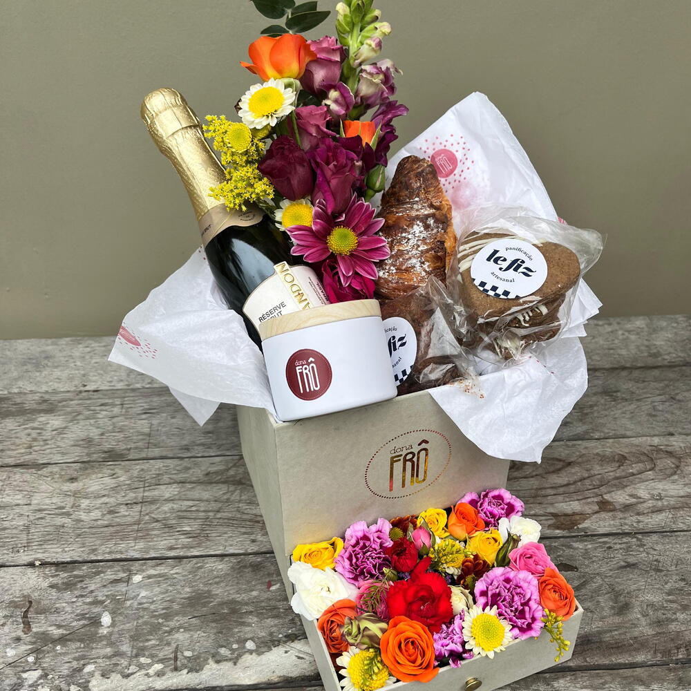 mix flores - 1 un. biscoitos - 1 un. mini chandon - 1 un. croissant chocolate - 1 un. vela artesanal - 1 un. box (caixa) com gaveta - 1 un.
