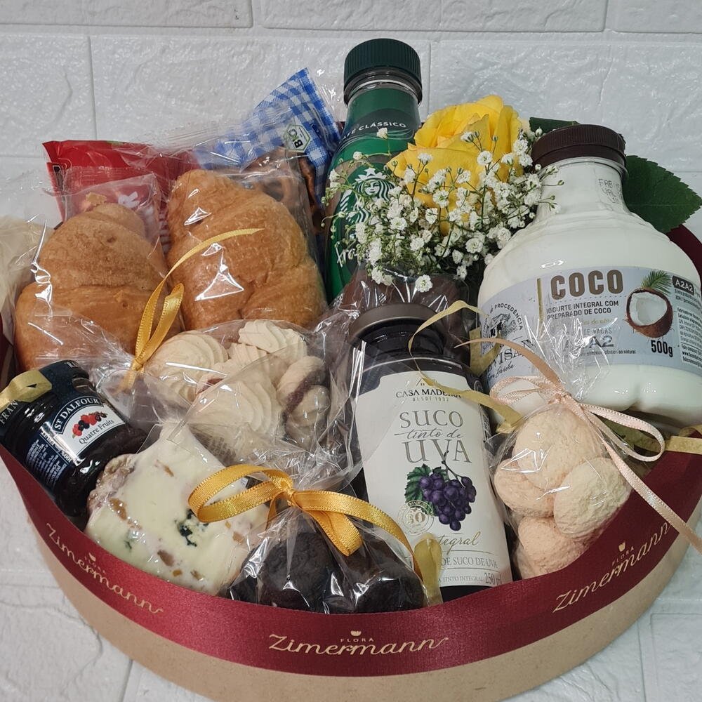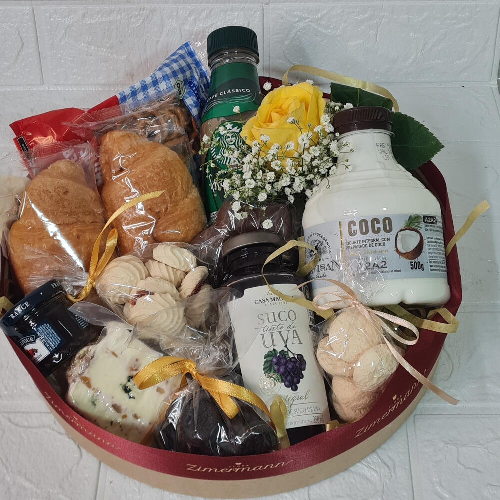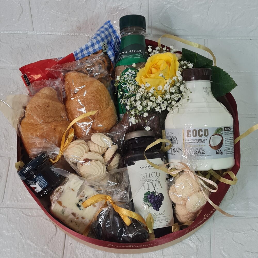 rosa - 1 un. croissant - 2 un. cesta - 1 un. biscoito salgado - 1 un. biscoitos doces - 3 un. suco 250 ml - 1 un. geleia p - 1 un. folhagens decorativas - 1 un. queijo 150 gr - 1 un. iogurte 500 ml - 1 un.