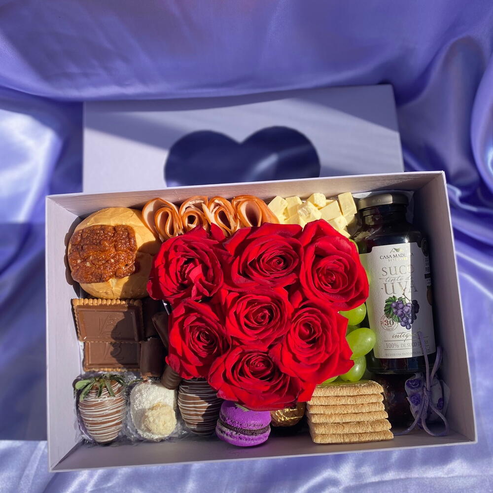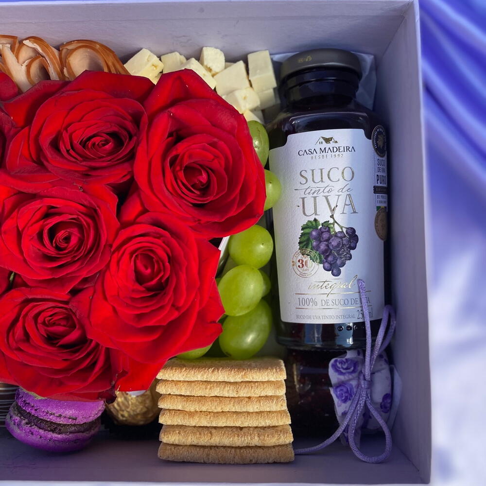 rosa - 7 un. suco - 1 un. chocolates - 1 un. salame - 1 un. biscoitos - 1 un. pães - 1 un. bolachas - 1 un. caixa com tampa de coração transparente - 1 un.