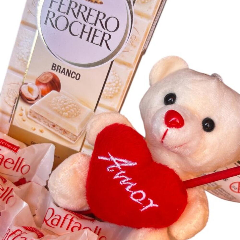 laço especial - 1 un. bombom raffaello - 4 un. ursinho de pelúcia tamanho p - 1 un. celofane embalagem - 1 un. ferrero rocher branco barra 90g - 1 un. coração vermelho plick - 1 un.