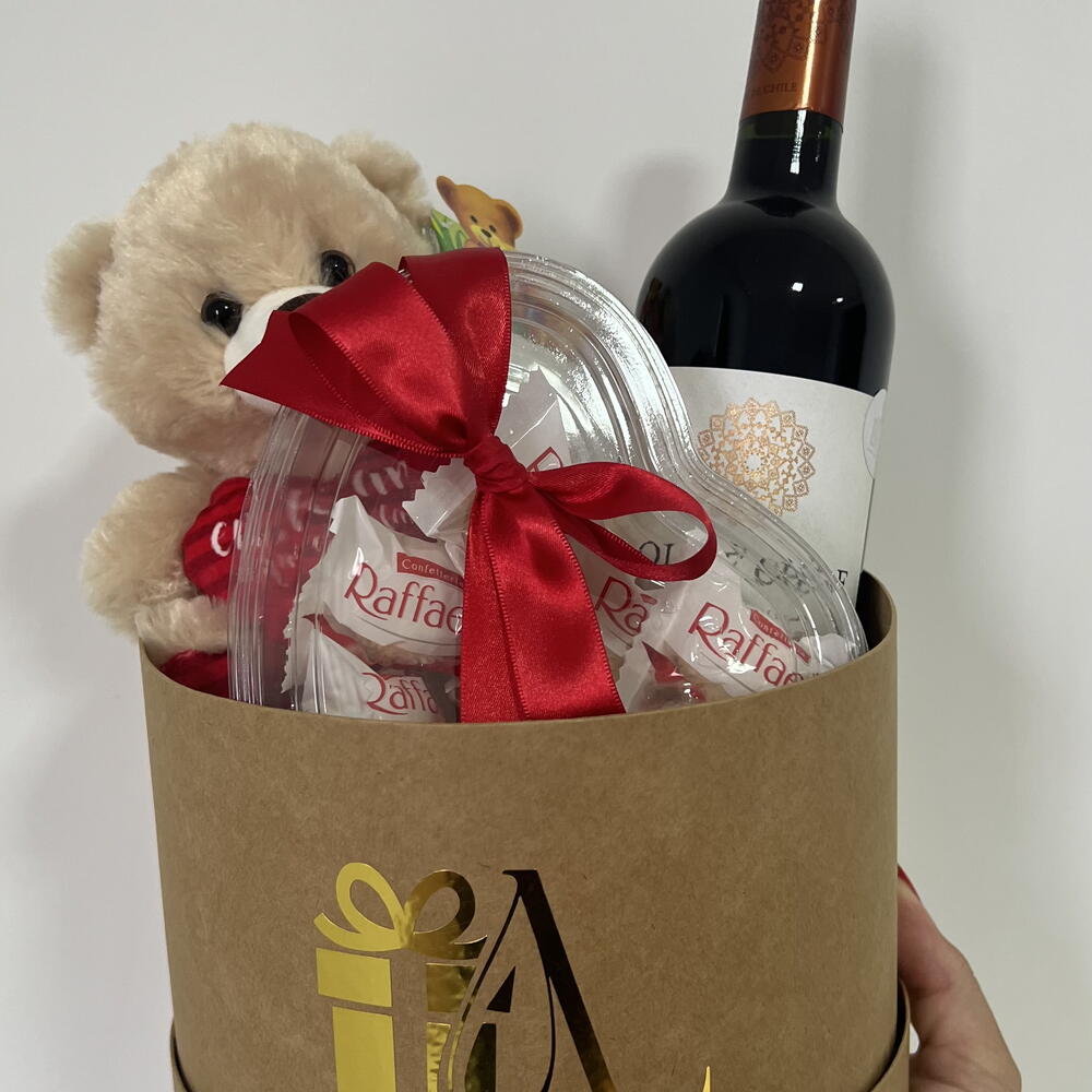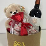 Este presente com bebida apresenta um elegante urso de pelúcia como companheiro adorável, acompanhado por uma garrafa de nosso vinho selecionado para despertar os sentidos. Completa a experiência com dez unidades de Rafaello, oferecendo uma explosão de sabor doce e irresistível. Tudo isso é lindamente presenteado em uma caixa cuidadosamente projetada, fazendo desta uma opção de presente ideal para momentos especiais.