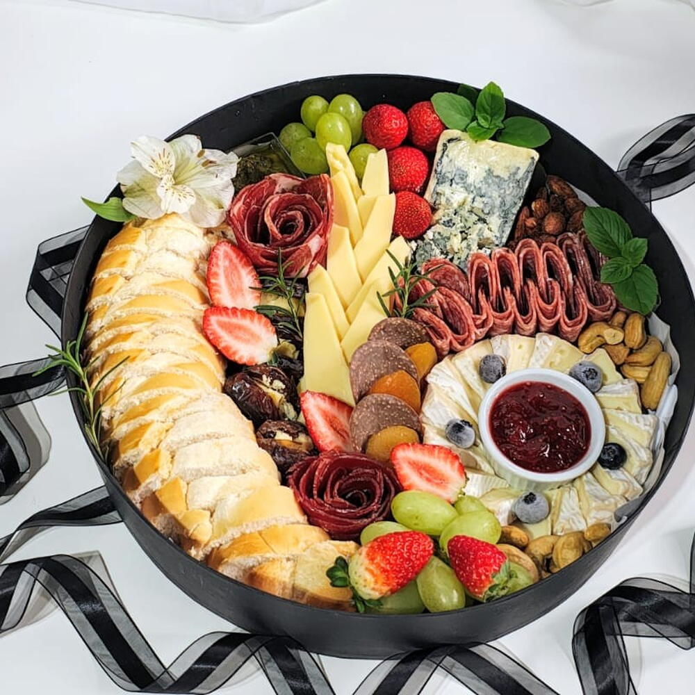 Uma noite memorável começa aqui. Cada detalhe desta box foi pensado para criar momentos que merecem ser eternizados. 3 Queijos nobres entre: gouda, estepe, gorgonzola, parmessão, camembert, brie, dividem espaço com 3 charcutaria entre elas: salame hamburguês, copa, lombo canadense. Tâmaras recheadas com gorgonzola, damascos, morangos e uvas trazem o toque adocicado. O sabor é finalizado com pão baguete, geleia artesanal, pastinha ou compota, mix de castanhas e amêndoas defumadas. . Caixa cartonada finalizado com laço de cetim. Serve 2 a 3 pessoas como refeição principal ou 4 pessoas como entrada. Acompanha cartão de mensagem.