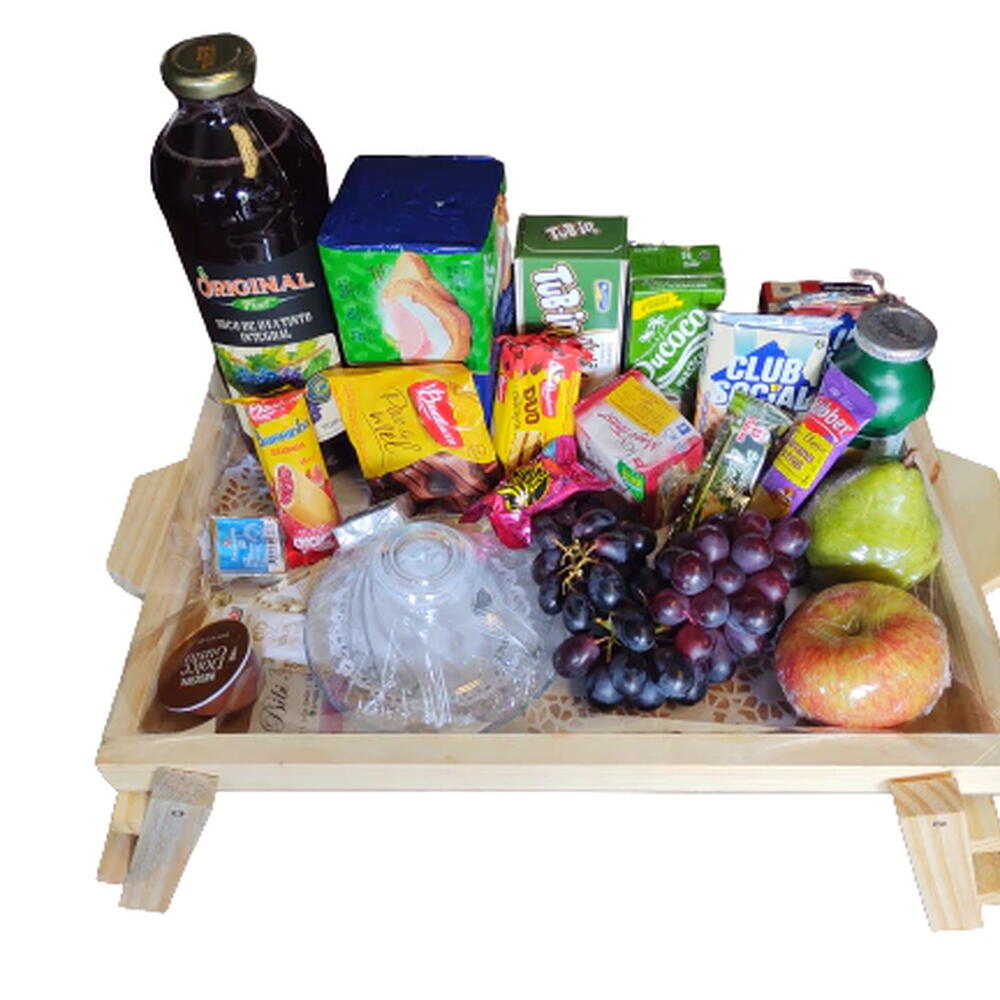 Composição: Uma bandeja de madeira charmosa (43x29) recheada com delícias para um café da manhã perfeito! Inclui 01 xícara com pires, 01 suco integral de uva (500ml), 01 achocolatado (200ml) e 01 iogurte (200ml). Para os amantes de café, não pode faltar a cápsula de café e 02 sachês de açúcar. Delicie-se também com 02 Club Social (24g), 01 Polenguinho (17g), 01 pão de mel Bauducco, 01 barra de cereal (20g), 01 cookies Bauducco e 01 goiabinha Bauducco (48g). água de coco (200ml)Para completar, 01 torrada (200g), 01 bolinho Bauducco (40g), 01 bombom (20g), 01 geléia (15g) e 03 frutas fresquinhas (pera, uva e maçã). Ah, e um arranjo de astromélias mistas para dar aquele toque especial! Obs: Todos os itens poderão sofrer alterações dependendo da disponibilidade local, sempre mantendo a qualidade. (FOTO ILUSTRATIVA)