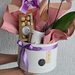 laços cetim - 2 un. ferreiro rocher 8 un - 1 un. caneca personalizada com inicial nome - 1 un. orquídea enfeitada - 1 un. balao bubble m - 1 un.