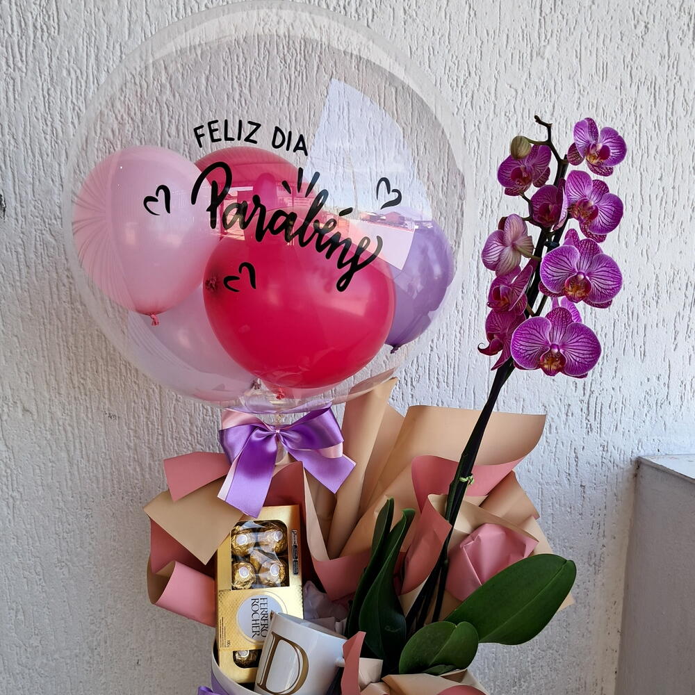 laços cetim - 2 un. ferreiro rocher 8 un - 1 un. caneca personalizada com inicial nome - 1 un. orquídea enfeitada - 1 un. balao bubble m - 1 un.