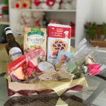 bandeja mdf - 1 un. botões de rosa - 2 un. pacote bruschette morretti vegetais - 1 un. pacote crostatina italiana de frutas vermelhas - 1 un. pedaço de queijo fracionado - 1 un. vidro de patê - 1 un. porção de castanhas mix - 1 un. barra de chocolate importado - 1 un. cerveja importada - 1 un.