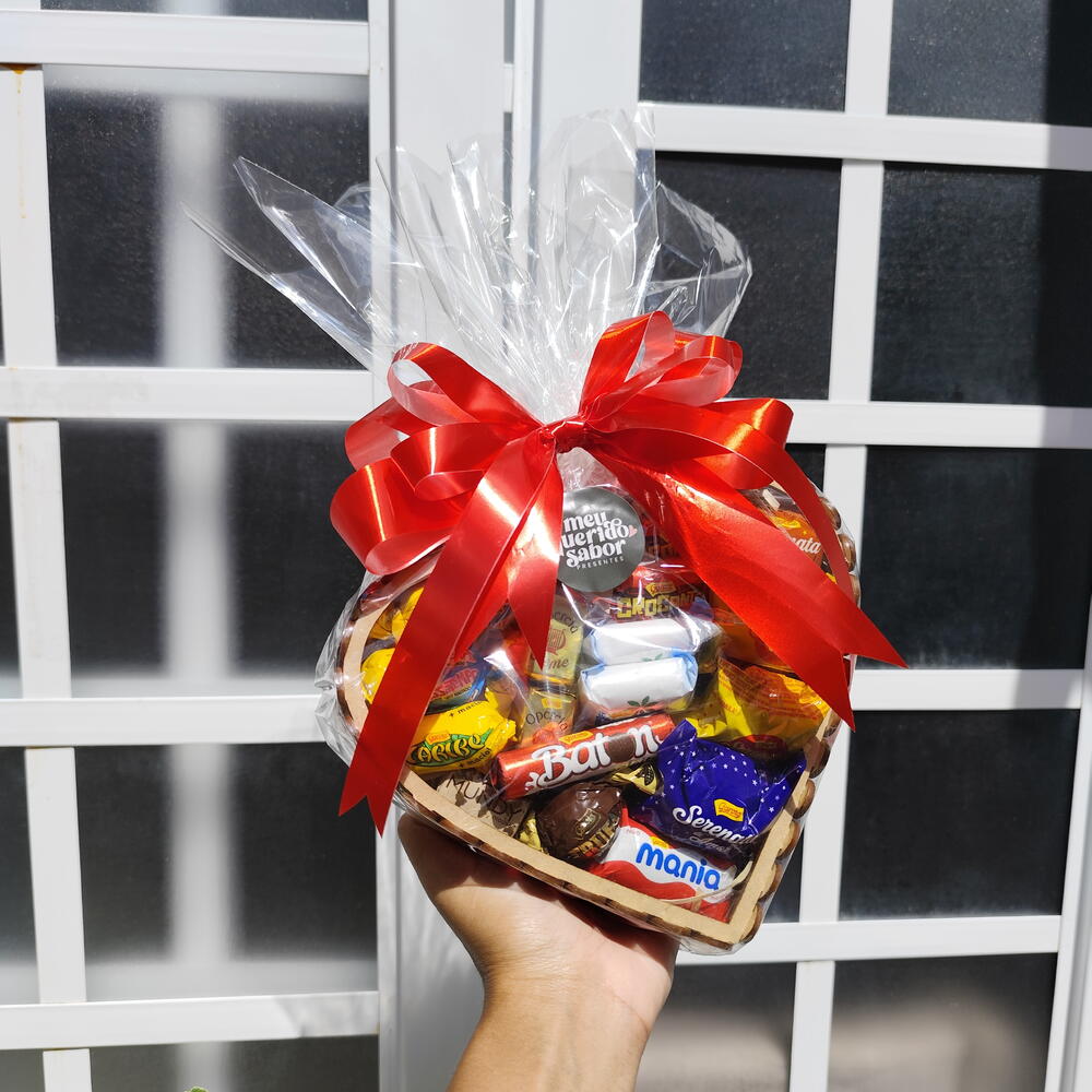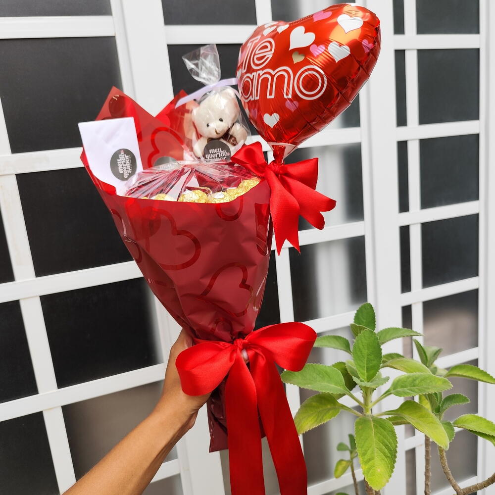 Cesta em formato de coração em madeira Mdf com 1 caixa de bombom Garoto (16/17 unidades sortidos) OU bombons Nestlé (14 unidades sortidos), cuidadosamente montada com acabamento premium e pronta para surpreender. Bilhete impresso com envelope + mini ursinho de chaveiro + balão coração. Buquê em formato de coração com 17 Ferrero Rocher e 3 rosas em embalagem premium, proteção transparente e laço. Ideal para presentear em aniversário, pedido de namoro, pedido de desculpas, Dia da Mulher, Dia das Mães e Dia dos Namorados. Uma opção diferente do tradicional de floricultura, flores ou cesta de café da manhã — um presente criativo, elegante e marcante.