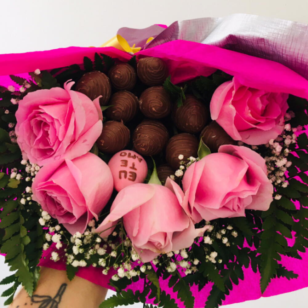 embalagem - 1 un. rosa pink - 5 un. folhagens - 1 un. laço - 1 un. morangos com chocolates - 12 un.
