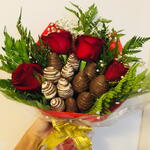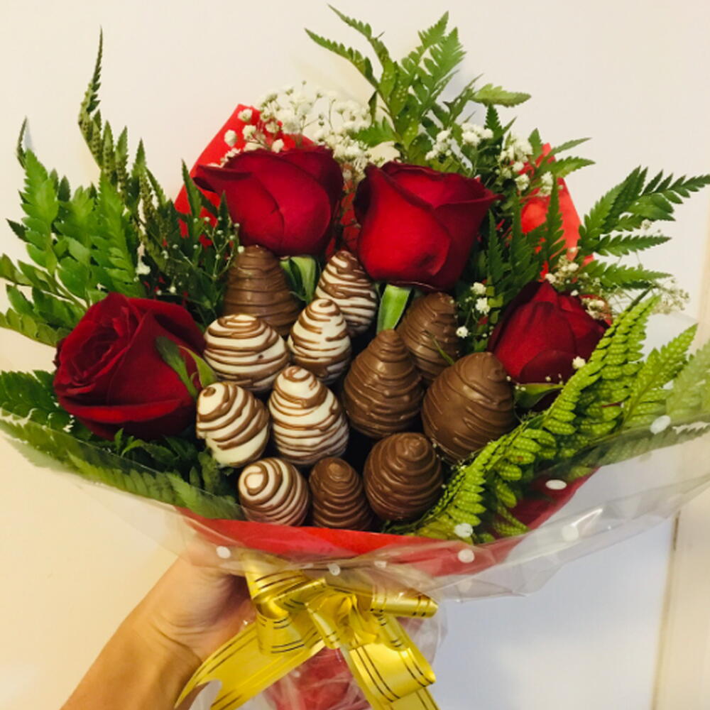 rosa - 4 un. embalagem - 1 un. folhagens - 1 un. laço - 1 un. morango - 12 un.