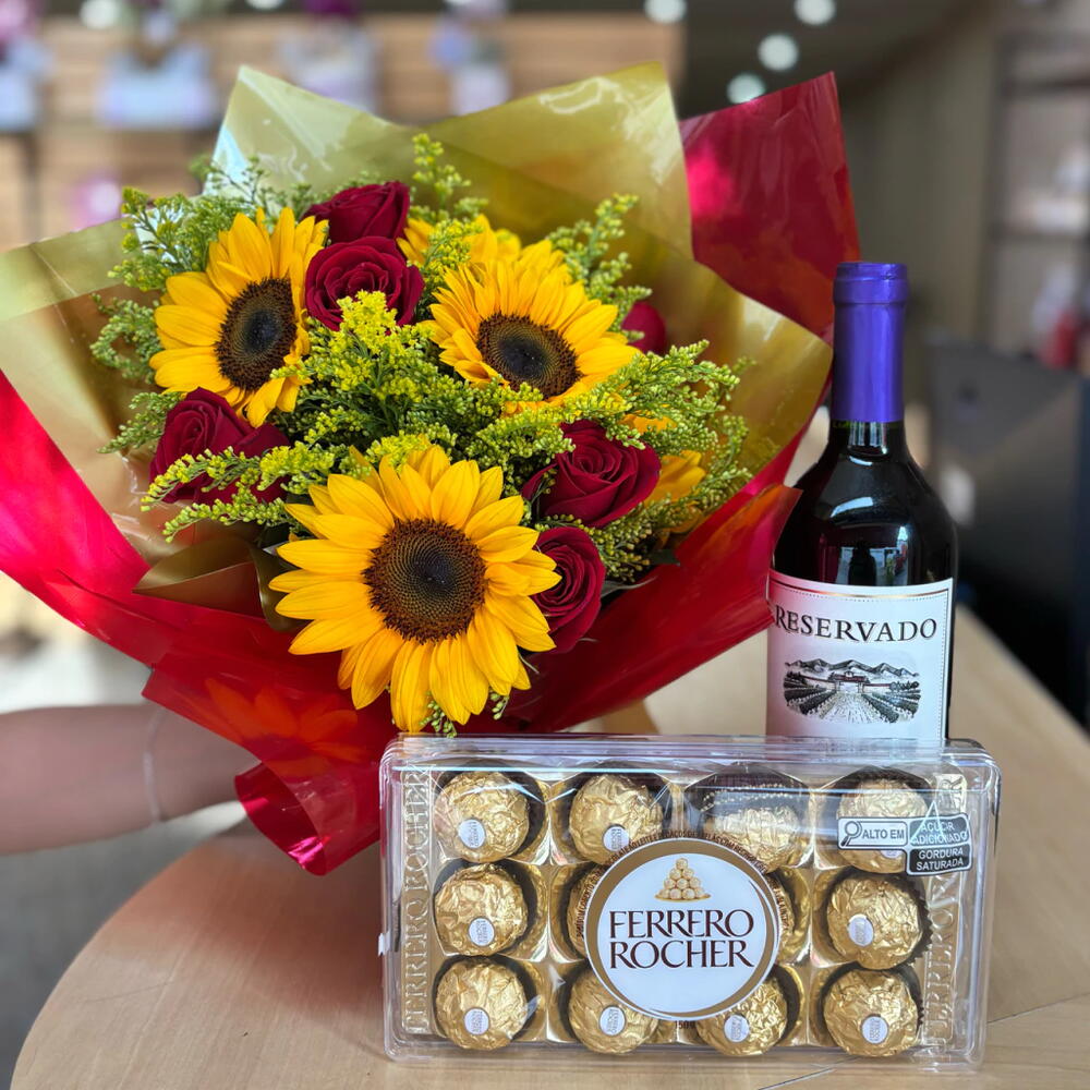Buquê Medio de Rosas e Girassol + Vinho + Ferrero 12 Unidades