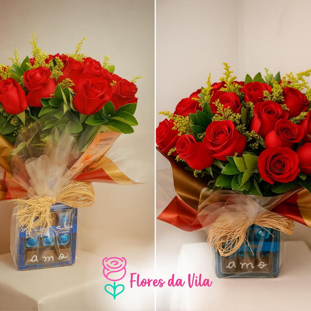 rosa vermelhas nacionais - 24 un. embalagem especial - 3 un. folhagens verdes diversas - 2 un. laço decorativo - fios de ráfia - 1 un. caixa de bombons eu te amo - 1 un.