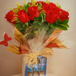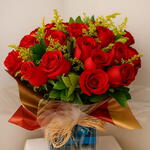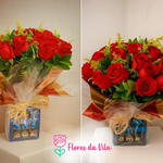 Delicie-se com este maravilhoso presente composto por 24 rosas vermelhas nacionais e duas unidades de folhagens verdes diversas, perfeitamente dispostas em uma embalagem especial. O pacote é decorado com um laço feito de fios de ráfia para proporcionar uma apresentação elegante. Completa com uma doce surpresa, uma caixa de bombons de chocolate com uma doce confissão - Eu te amo. Este conjunto de flores e chocolate é a melhor maneira de expressar seu amor e apreço por alguém especial.