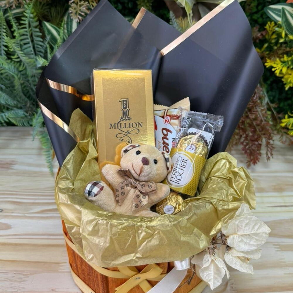 Descubra a cesta de chocolate perfeita para qualquer ocasião. Nossas cestas são embaladas com os melhores produtos incluindo o estimado chocolate Kinder Bueno, três unidades de Ferrero Rocher irresistíveis, agradando a todos os paladares. A cesta também traz um presente adorável e fofinho, um chaveiro em forma de ursinho de pelúcia para proporcionar um toque extra de carinho. Para completar esta oferta excepcional, incluímos um perfume One Million de 100 ml, deixando um rastro envolvente. Tudo isso cuidadosamente organizado em uma elegante cesta tornando-se um presente ideal.