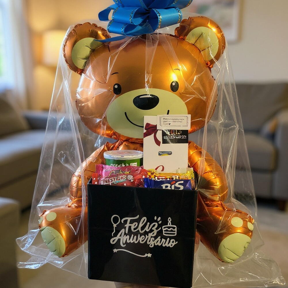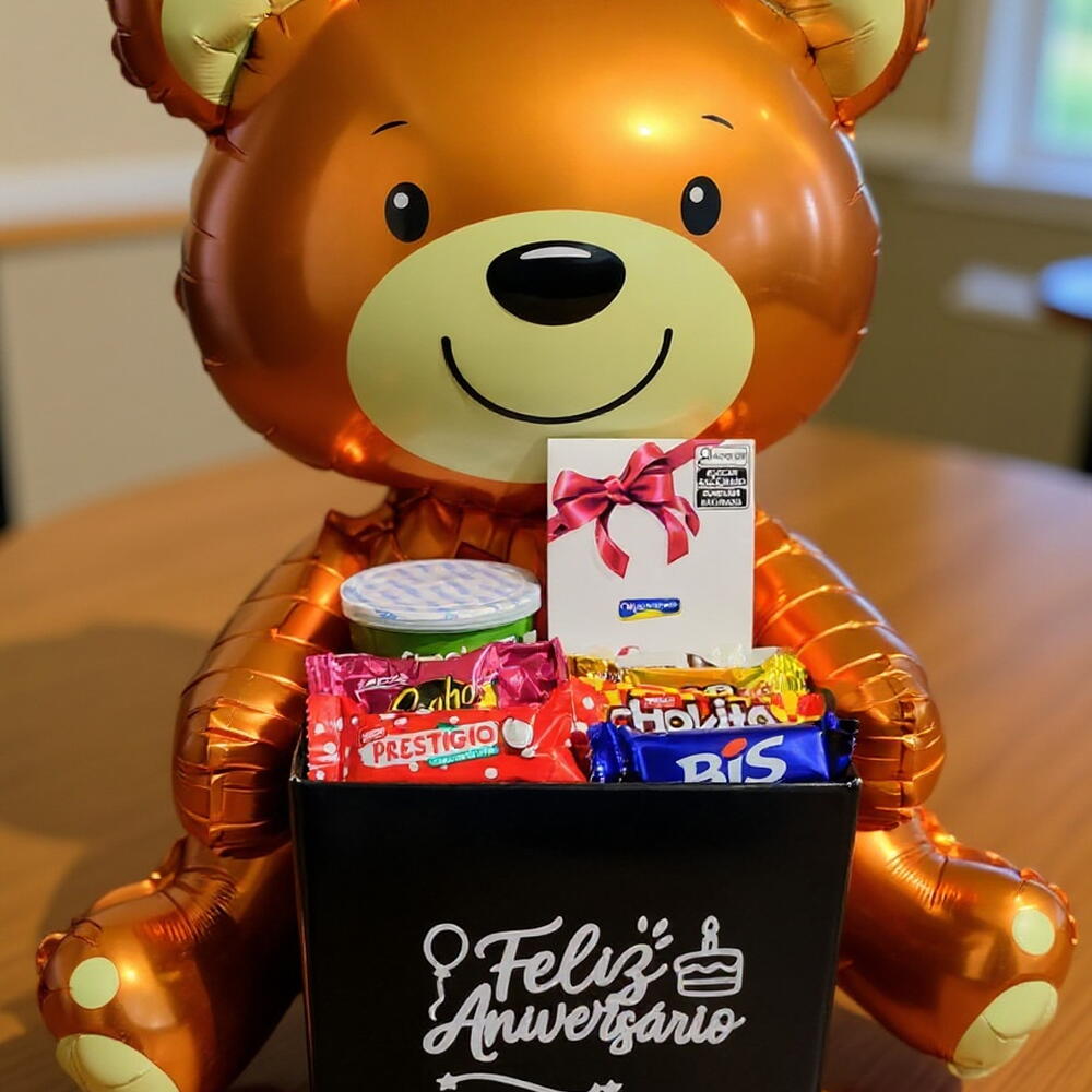 bombons - 7 un. salgadinho - 1 un. balao - 1 un. box (caixa) - 1 un. cachepo com chocolates - 2 un.