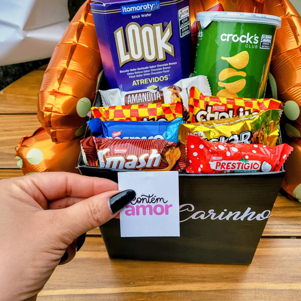 **Descrição do Presente:** Surpreenda quem você ama com esta cesta encantadora, repleta de delícias! • **Conteúdo:** Chocolates variados, salgadinhos e uma caixa especial da LOOK. • **Detalhes:** A cesta vem acompanhada de um cartão personalizado com a mensagem Contém amor Carinho. • **Ocasiões:** Ideal para aniversários, celebrações ou simplesmente para demonstrar carinho. Contém 7 bombons deliciosos 1 caixa de canudos recheados 1 batata pingles Um presente que combina sabor e afeto, perfeito para alegrar o dia de alguém especial!