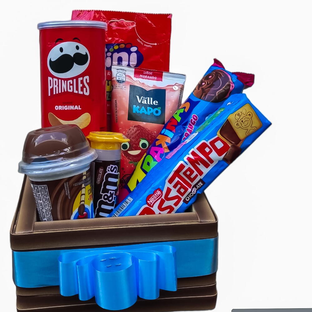 cachepô - 1 un. fini - 1 un. pringles - 1 un. ioiô chocolate - 1 un. mems - 1 un. saco transparente celofane e laço para embalagem - 1 un. passatempo - 1 un. suco kapo (sabor pode variar) - 1 un. traquinas - 1 un.