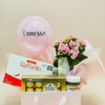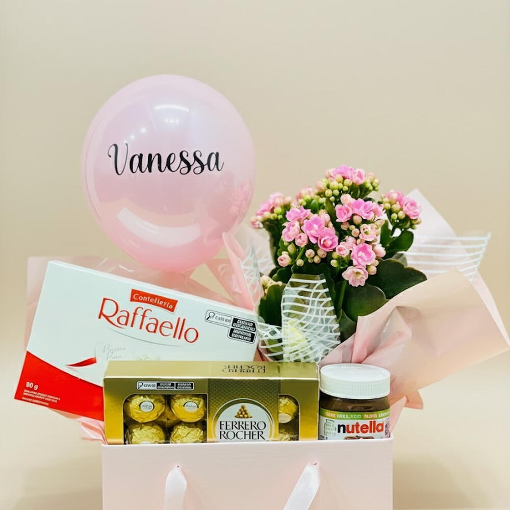 Este conjunto luxuoso Flores e Chocolates de edição limitada é a opção perfeita para presentear alguém especial. Ele inclui uma elegante Caixa Retangular Rosa, preenchida com uma seleção dos melhores chocolates gourmets - uma caixa de Rafaello e uma caixa do incomparável Ferrero Rocher. Para tornar esse presente ainda mais doce, adicionamos um pote de Nutella de 140g, perfeito para agradar os amantes de chocolate. Além disso, um lindo Vaso de Flor Kalanchoe acompanha o conjunto, juntamente com um sofisticado Balão Personalizado que adiciona um toque final atraente a este presente inesquecível.
