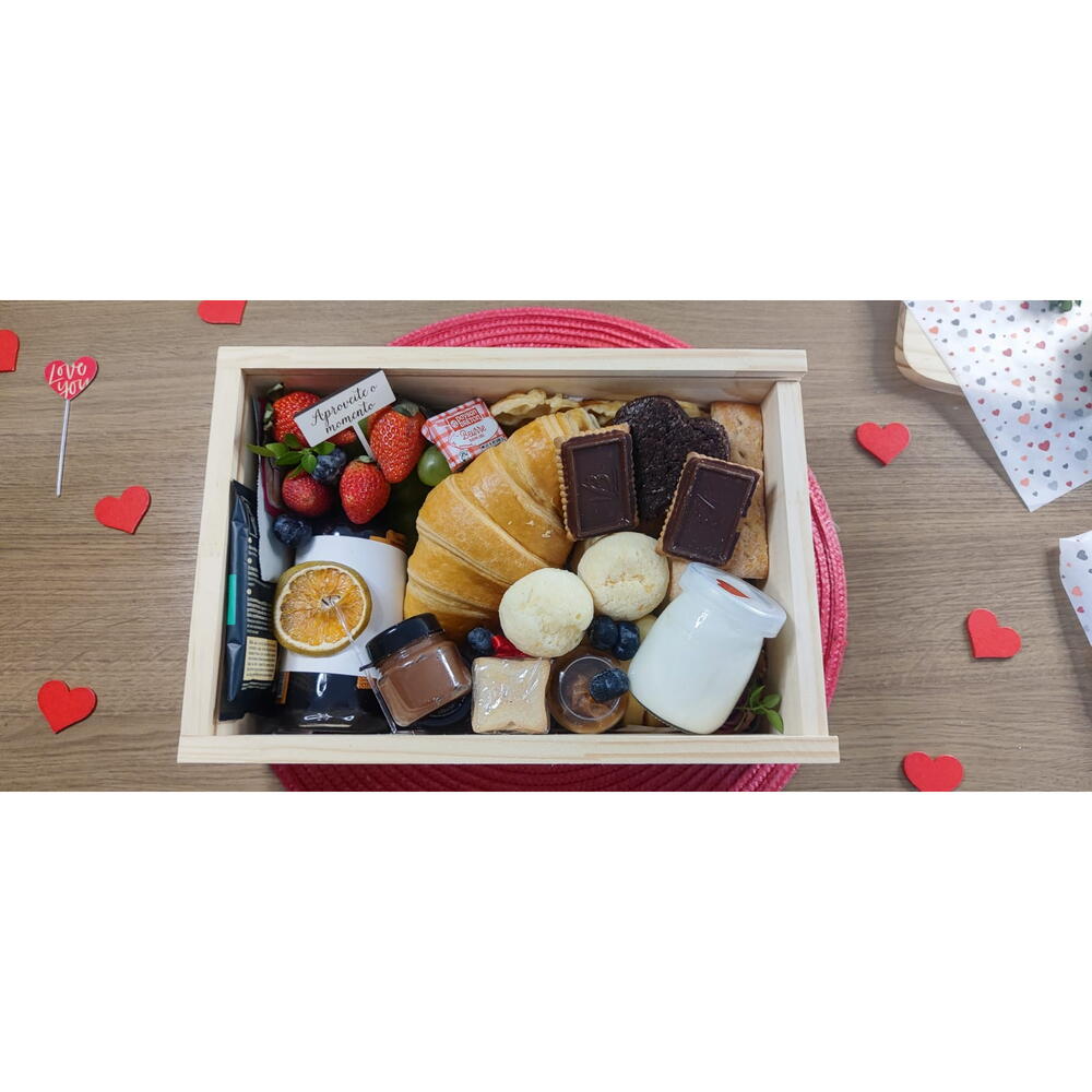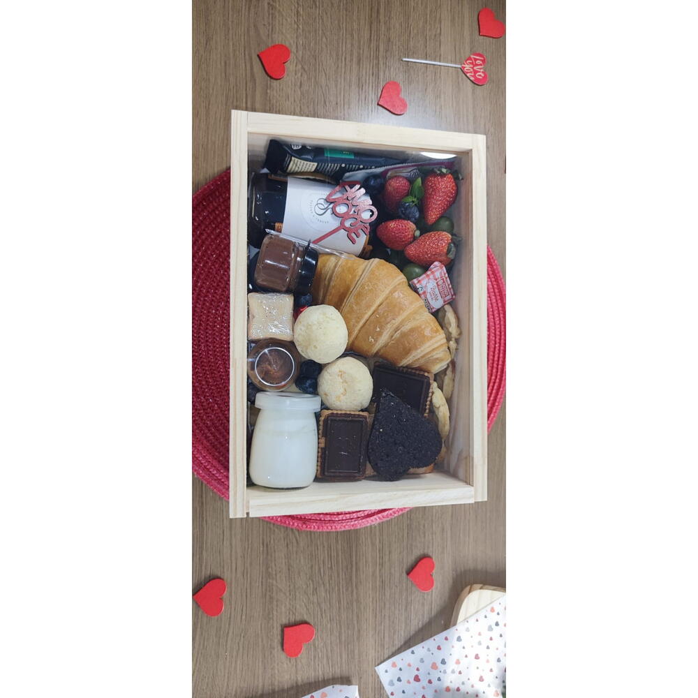 Box lindissima com Um lindo café para dois montados em caixa com tampa modelo gaveta 30x20 de Pinus decorada com laço de cetim acompanha cartão + tag de/para tematica