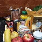nutella - 1 un. flor - 1 un. iorgute - 2 un. banana - 1 un. laço - 1 un. pera - 1 un. bolo - 1 un. suco de laranja - 2 un. pães - 2 un. cacho de uva - 1 un. maça - 2 un. fatias de presunto - 2 un. meio mamão - 200 gr. bandeja - 1 un. bolinho de chocolate - 2 un. fatias de muçarela - 2 un. ferrero richer 8 unidades - 1 un. saco de embalagem transparente - 1 un.