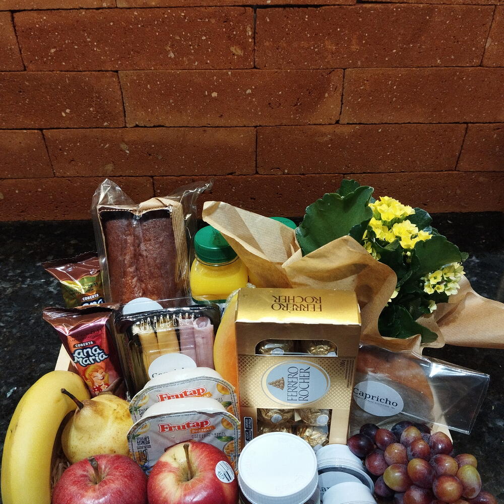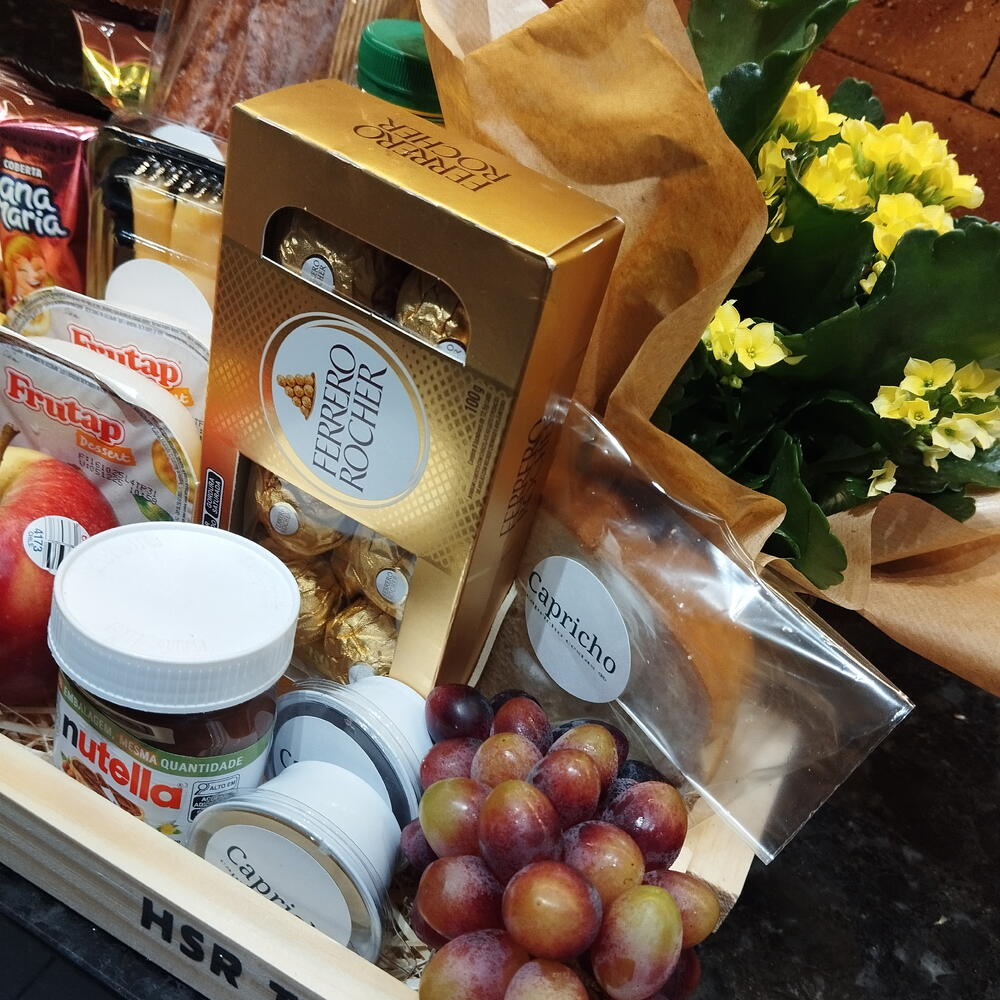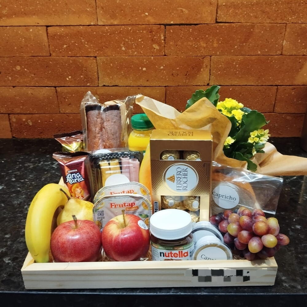 nutella - 1 un. flor - 1 un. iorgute - 2 un. banana - 1 un. laço - 1 un. pera - 1 un. bolo - 1 un. suco de laranja - 2 un. pães - 2 un. cacho de uva - 1 un. maça - 2 un. fatias de presunto - 2 un. meio mamão - 200 gr. bandeja - 1 un. bolinho de chocolate - 2 un. fatias de muçarela - 2 un. ferrero richer 8 unidades - 1 un. saco de embalagem transparente - 1 un.