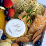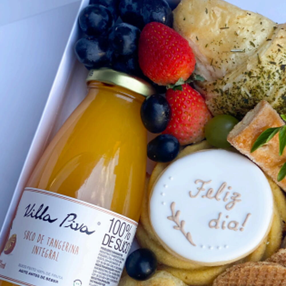 croissant recheado - 1 un. queijo frescal - 1 un. folhados - 1 un. minibolo - 1 un. sucovillapiva 300ml - 1 un. pãesdequeijos - 3 un. frutasdodia - 2 un. cartãopersonalizado - 1 un. mini biscoito caramelizado - 1 un. biscoitodecorado amanteigado - 1 un.