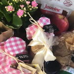 suco de uva - 1 un. iogurte - 1 un. chá twinings - 1 un. mel - 1 un. granola - 1 un. palha decorativa - 1 un. flor plantada - 1 un. pão português - 1 un. uva e maçã - 1 un. laço rústico - 1 un. tecido decorativo - 1 un. peito peru - 1 un. cuca - 1 un. queijo de minas - 1 un.