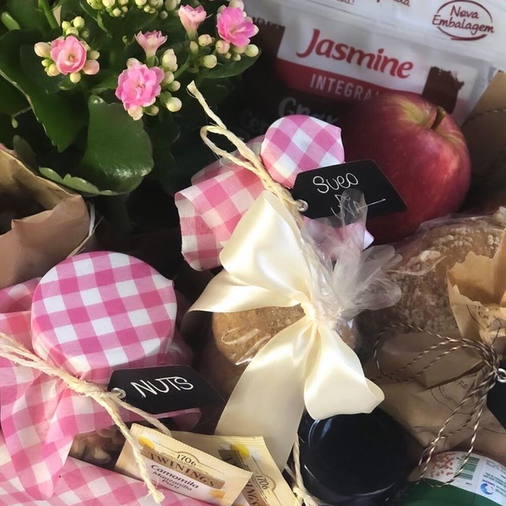 suco de uva - 1 un. iogurte - 1 un. chá twinings - 1 un. mel - 1 un. granola - 1 un. palha decorativa - 1 un. flor plantada - 1 un. pão português - 1 un. uva e maçã - 1 un. laço rústico - 1 un. tecido decorativo - 1 un. peito peru - 1 un. cuca - 1 un. queijo de minas - 1 un.