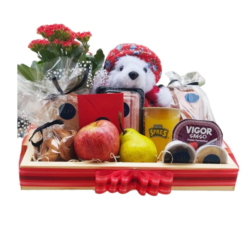 Esta deliciosa Cesta de Café da Manhã é a maneira perfeita de começar o dia. Inclui uma variedade de itens saborosos como um bolo suave, um iogurte refrescante e bolachinhas crocantes. Além disso, um pão de forma fresquinho acompanhado de fatias de muçarela e presunto para um lanche mais substancial. Lanche saudável é garantido com maçã e pera frescas, e um suco de laranja para saciar a sede. Para complementar esta magnífica cesta, incluímos potinhos de geleia e manteiga para dar um toque de luxo ao seu café da manhã. Mas o que é essa cesta sem um toque de amor? Uma linda flor para adornar e um urso de pelúcia carinhoso para embalar seu coração. Tudo isso cuidadosamente acondicionado em uma bandeja, com um kit para guarda e transporte. Faça do seu café da manhã um momento mais especial com nossa cesta.