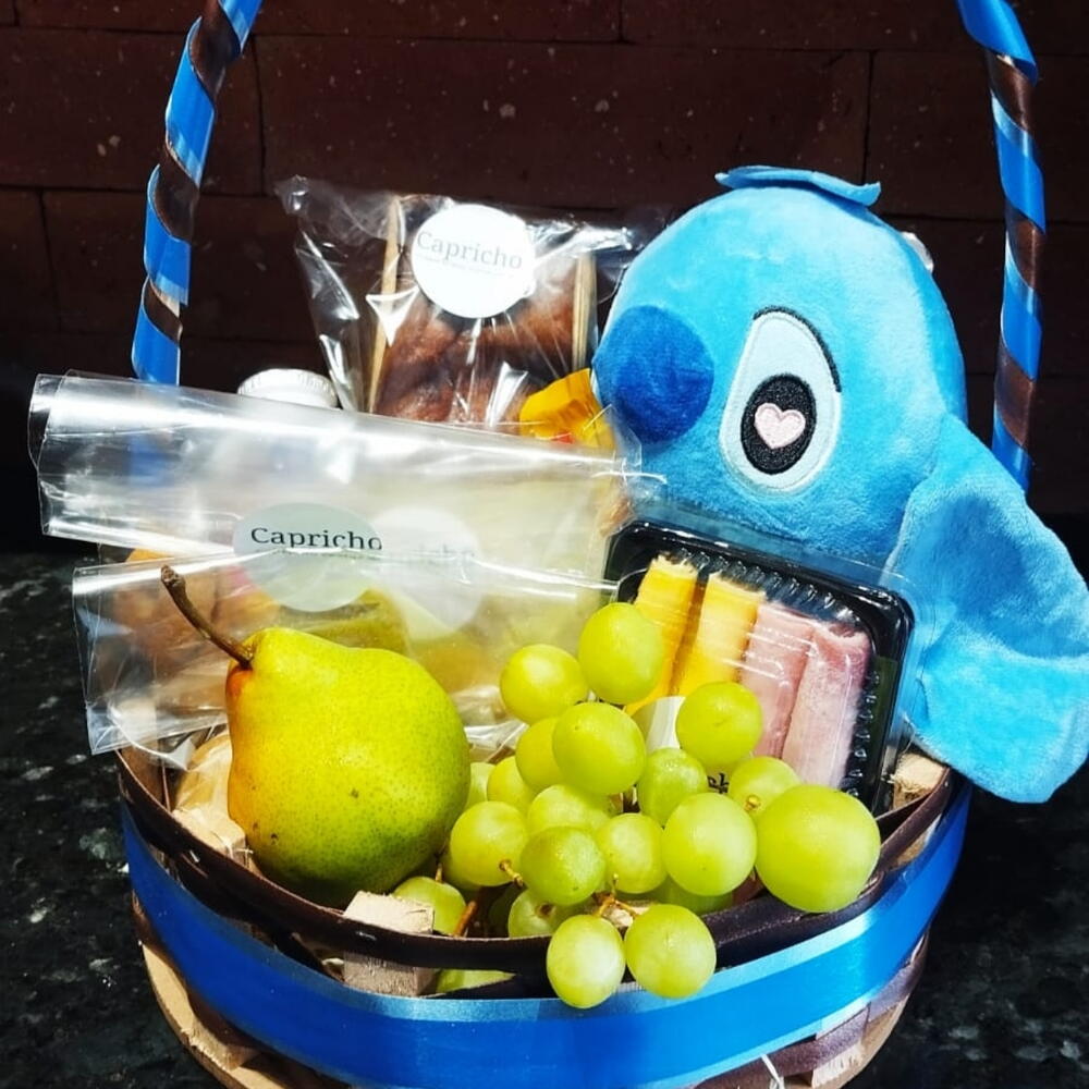 iogurte - 1 un. cesto de vime - 1 un. pão de queijo - 2 un. pão de forma - 2 un. todynho - 1 un. cacho de uva - 1 un. pêra - 1 un. fatia de presunto - 2 un. fatia de queijo - 2 un. stitch - 1 un. bolachinhas - 10 un. kit embalagem com laço personalizado e saco transparente - 1 un. bolo simples - 1 un.