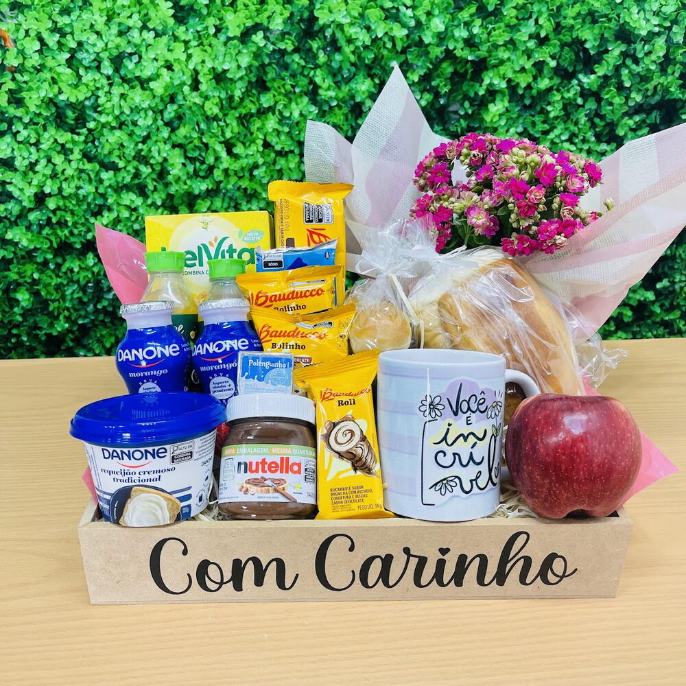 Este é um ítem perfeito para começar o dia com um sorriso! A nossa cesta de café da manhã vem com uma bandeja MDF resistente, recheada de delícias para tornar as suas manhãs ainda mais especiais. Contém pães frescos, Belvita, suco, deliciosos Danones, requeijão para dar aquele toque cremoso, Nutella para os amantes do chocolate, biscoitos Cookies e Club Social para uma refeição completa. Também inclui bolinhos macios, Polenguinho e duas frutas saudáveis e frescas. Para alegrar ainda mais o seu dia, incluímos uma flor Kalanchoe e uma caneca com a mensagem Você é incrível. Ideal para demonstrar o seu carinho nas manhãs de alguém especial ou tratar a si mesmo com um café da manhã luxuoso.