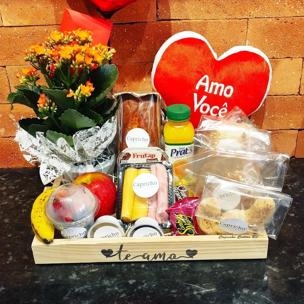 flor - 1 un. coração de pelucia - 1 un. iorgute - 1 un. banana - 1 un. sonho de valsa - 2 un. pão francês - 1 un. pão doce - 1 un. pão de forma - 2 un. suco de laranja - 1 un. cacho de uva - 1 un. maça - 1 un. potinho de geleia - 1 un. bolachinha de leite - 10 un. bolo simples - 1 un. potinho de margarina - 1 un. fatia presunto - 2 un. fatia queijo - 2 un. bandeja te amo - 1 un. kit embalagem saco plastico e laço - 1 un.