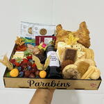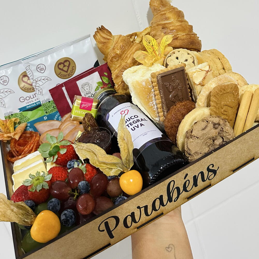 chocolates - 1 un. laço - 1 un. croissant recheado - 1 un. waffles - 1 un. queijos - 2 un. drip coffe - 1 un. geleia artesanal - 1 un. embalagem celofane - 1 un. charcutarias - 2 un. frutas frescas - 1 un. caixa em madeira - 1 un. frutas desidratadas - 1 un. torradas slim - 1 un. pães de queijo recheado - 1 un. seleção de biscoitos finos - 1 un. chocolate quente ou cappuccino - 1 un. pães salgados e doces - 1 un. madelines - 1 un. suco 300ml ou frapuccino - 1 un. cha twinings - 1 un.