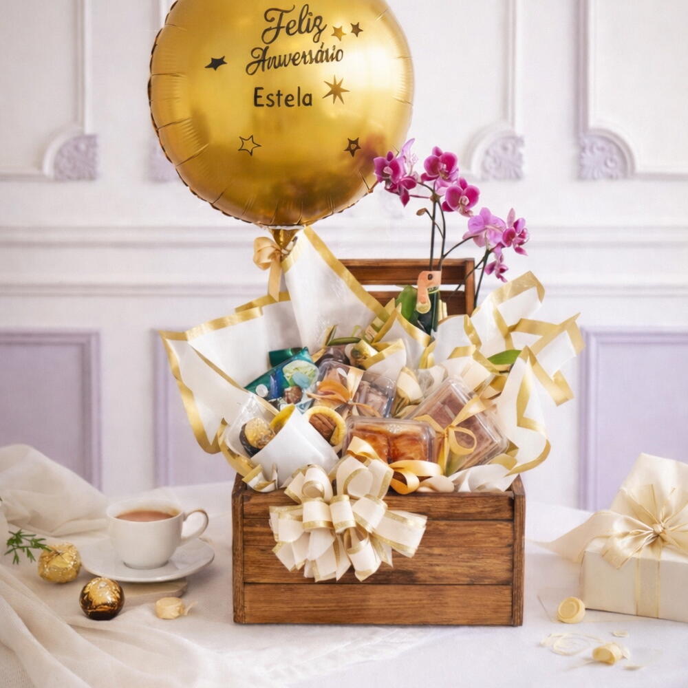 caneca - 1 un. brigadeiros - 4 un. suco de uva integral - 1 un. drip coffee - 2 un. balão foil - 1 un. uvas) - 1 un. orquídea phalaenopsis (cor disponivel) - 1 un. baú de madeira pinus. - 1 un. ferrero rocher 3unid - 1 un. pastéis de frango - 4 un. geleia maribo - 1 un. pastéis de carne - 4 un. pães ninho delícia - 4 un. sachê de torradinhas - 2 un. mix de frutas (morangos - 1 un.