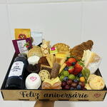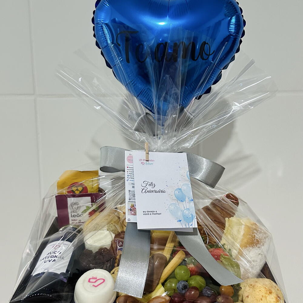 queijo - 1 un. chocolates - 1 un. laço - 1 un. geleia - 1 un. chá twinings - 1 un. croissant recheado - 1 un. waffles - 1 un. doce de leite - 1 un. drip coffe - 1 un. embalagem celofane - 1 un. frutas frescas - 1 un. muffin de chocolate - 1 un. charcutaria - 1 un. balão personalizado (verificar disponibilidade) - 1 un. pães salgado e doce - 1 un. torradas slim - 1 un. pães de queijo recheado - 1 un. seleção de biscoitos finos - 1 un. suco 300 ml ou frapuccino - 1 un. chocolate quente ou cappuccino - 1 un. iogurte ou mini pudim - 1 un. requeijão cremoso ou cream cheese - 1 un. medeline - 1 un. tag e cartão - 2 un. caixa em madeira personalizada (verificar disponibilidade) - 1 un.
