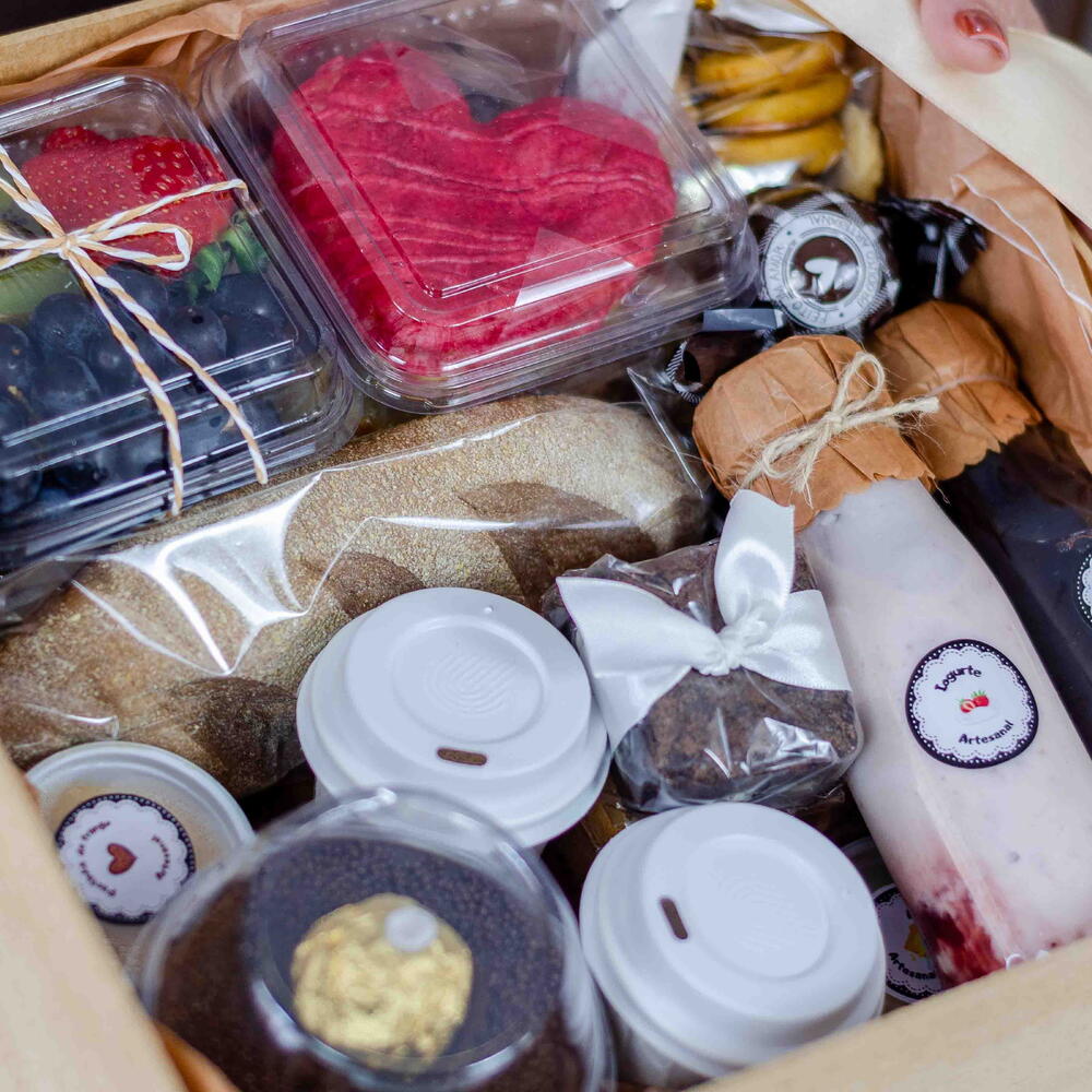 nutella - 30 gr. chocolate - 1 un. croissant - 1 un. torradas - 4 un. iogurte - 1 un. manteiga - 30 gr. cappuccino - 1 un. waffles - 1 un. suco de uva integral - 250 ml cacho de uva - 1 un. requeijão - 30 gr. pasta de frango - 60 gr. biscoitos finos amanteigados - 120 gr. geleia artesanal - 30 gr. baguete australiana - 1 un. trufa de chocolate - 1 un. queijo e presunto em fatia - 4 un. laço de tecido - 1 un. cartão personalizado com sua mensagem - 1 un. pão de queijo medio - 4 un. arranjo flores secas - 1 un. caixa de madeira rústica 30x30x10 cm - 1 un. ring donuts gr - 1 un. brownie recheado ninho c nutella - 1 un. morangos frescos selecionados - 3 un. bolo de chocolate belga com creme de chocolate e chantilly com morango ou ferrero roche - 1 un.