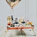 Surpreenda alguém especial com o encanto do Café na Cama. Este completo pacote traz uma experiência de café da manhã repleto de sabor e carinho. A bandeja de madeira com pés Tramontina proporciona uma apresentação elegante, enquanto o embrulho com laço de cetim e balões adiciona um toque festivo. O kit inclui uma variedade de delícias, desde sucos naturais até chocolates quentes, capuccino e iogurte com morango fresco e geleia. Além disso, você encontrará uma seleção de pães, frios, croissants, torradas, manteiga, requeijão, geleias e até Nutella. A diversidade de sabores se estende por pastinhas de frango, bolos de pote, ring donuts, biscoitos amanteigados, trufas, brownies e frutas frescas, completando um café da manhã cheio de amor e sabor. O bolo Bento poderá ser adicionado pelo valor de + R$35
